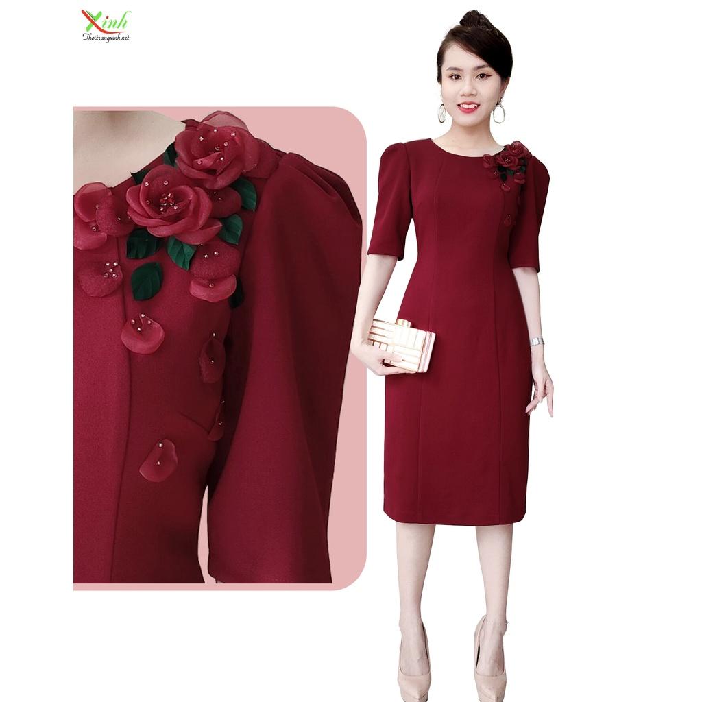 Đầm Đỏ Mận Kết Hoa Cườm Thủ Công Cao Cấp DL911