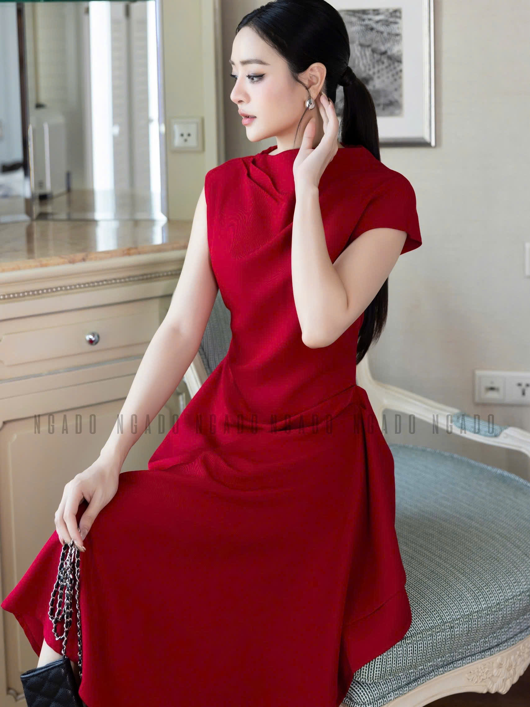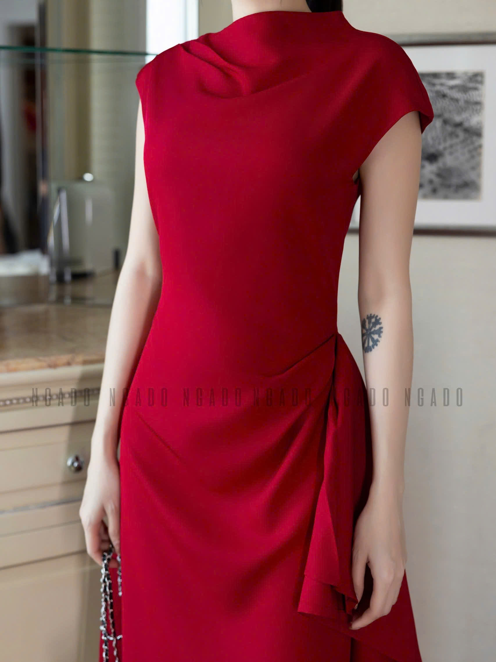 ✨Đầm đỏ cổ cao vạt xéo NGADO