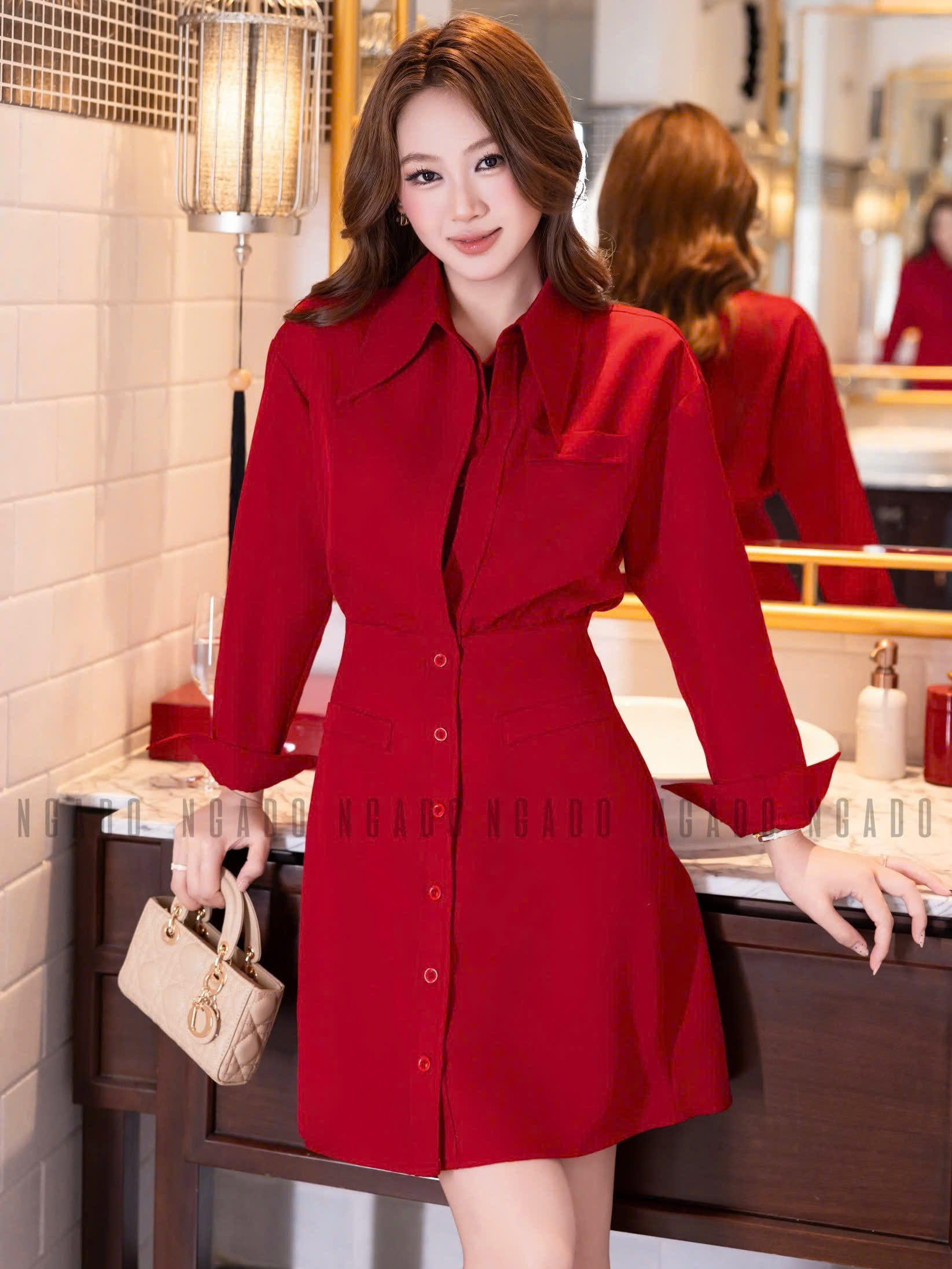 ✨Đầm đỏ cổ sơ mi NGADO , đầm sơ mi , đầm dự tiệc , công sở