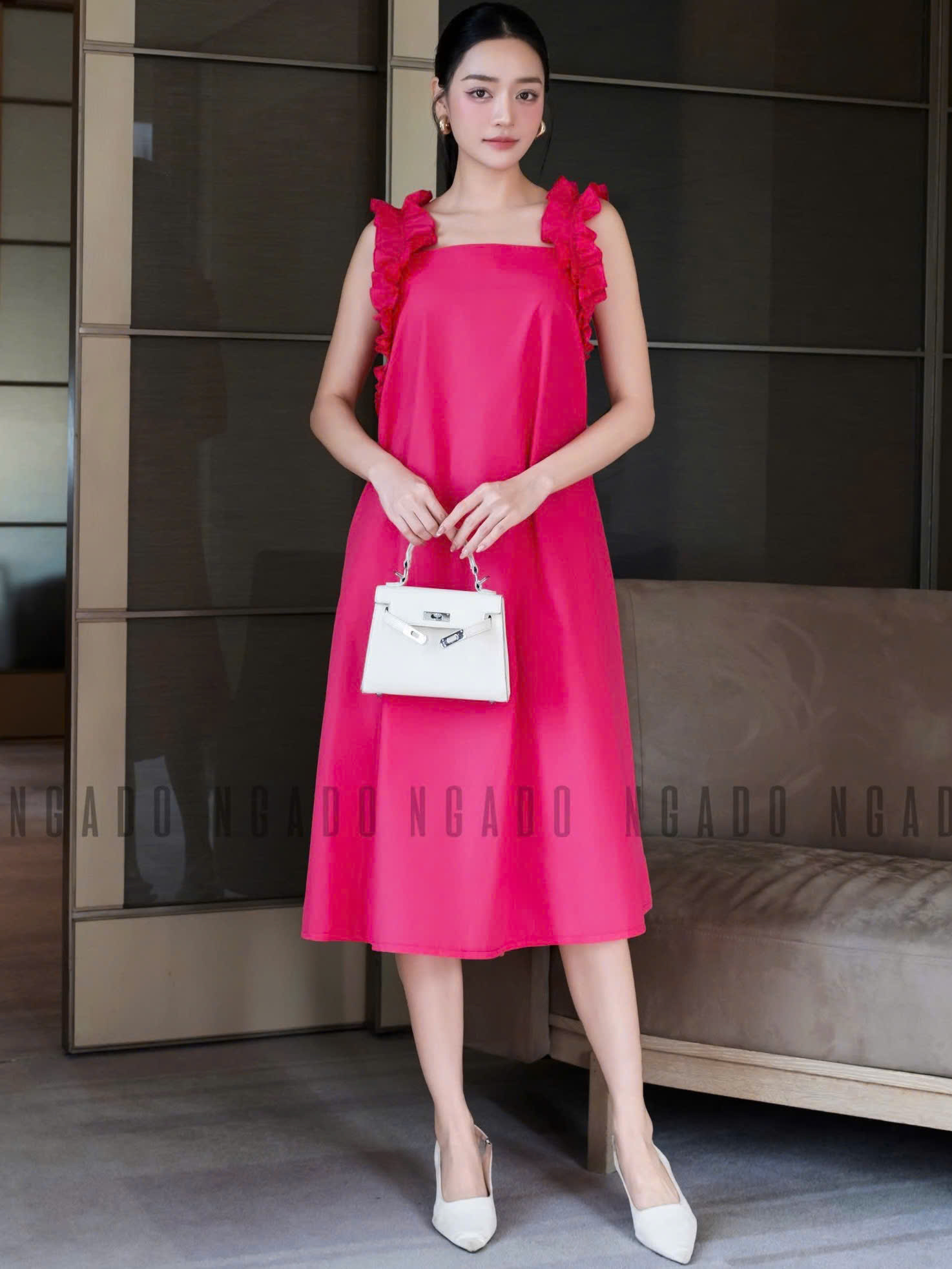 ✨Đầm hồng sen nhún vai NGADO , đầm suông , đầm dài