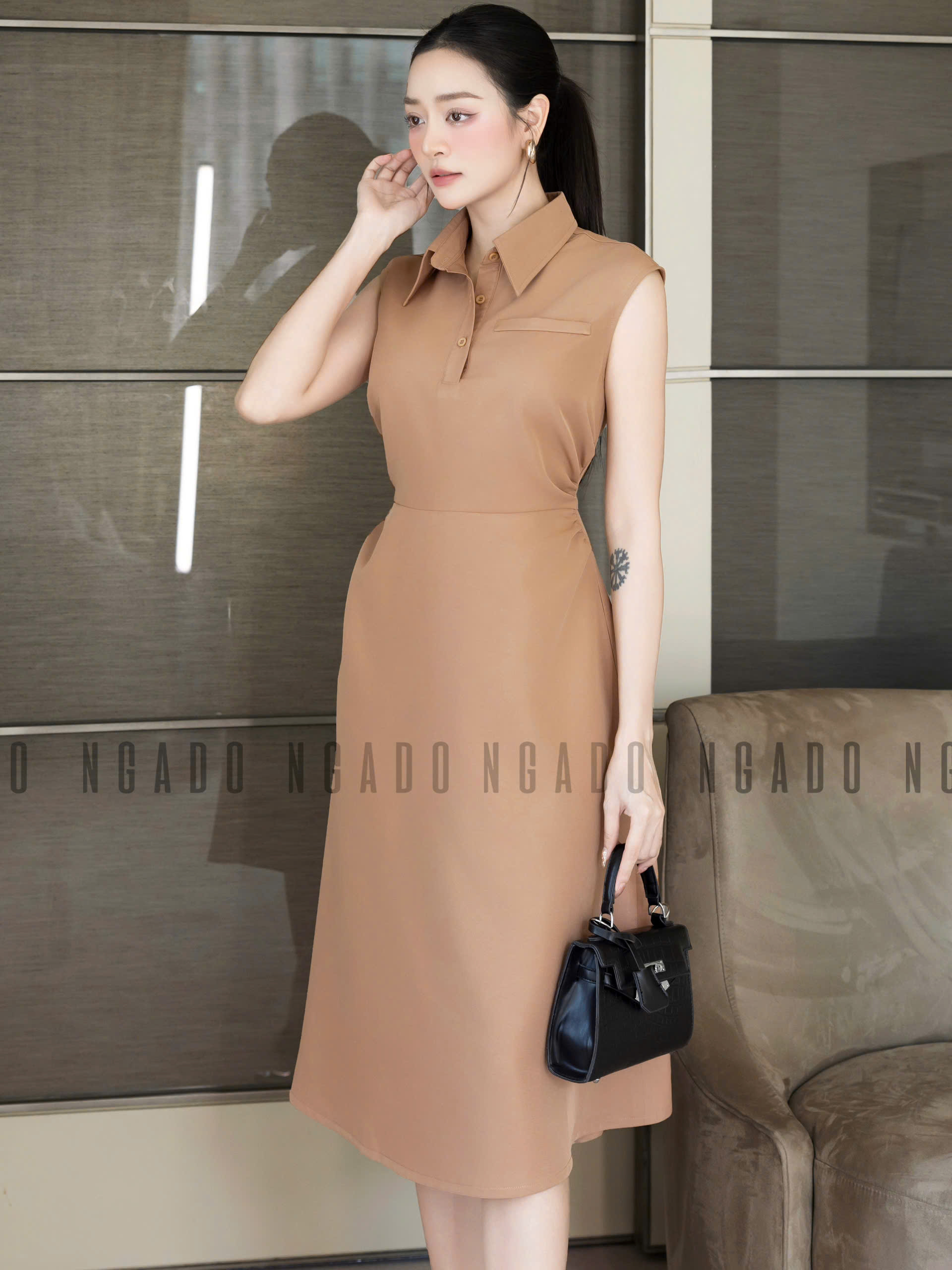 ✨Đầm nâu cổ sơ mi NGADO , đầm công sở , đầm dự tiệc