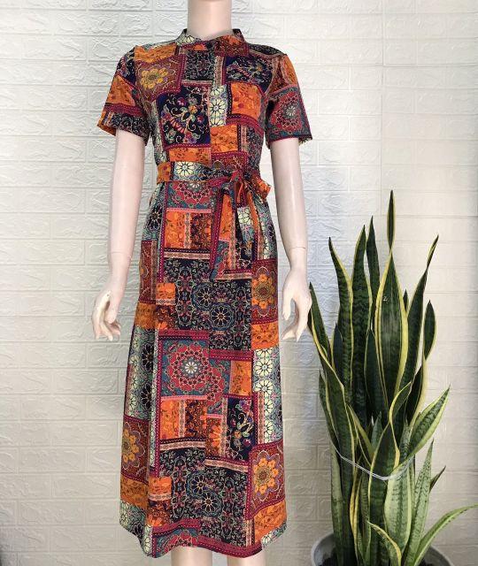 ĐẦM XOÈ HOẠ TIẾT HOA CỔ TRỤ Chất: lụa mango Màu: hoạ tiết như hình Kiểu dáng: đầm xoè cổ trụ, tay ngắn, cài nút trước ẩn, kèm dây thắt eo rời, dây kéo bên
