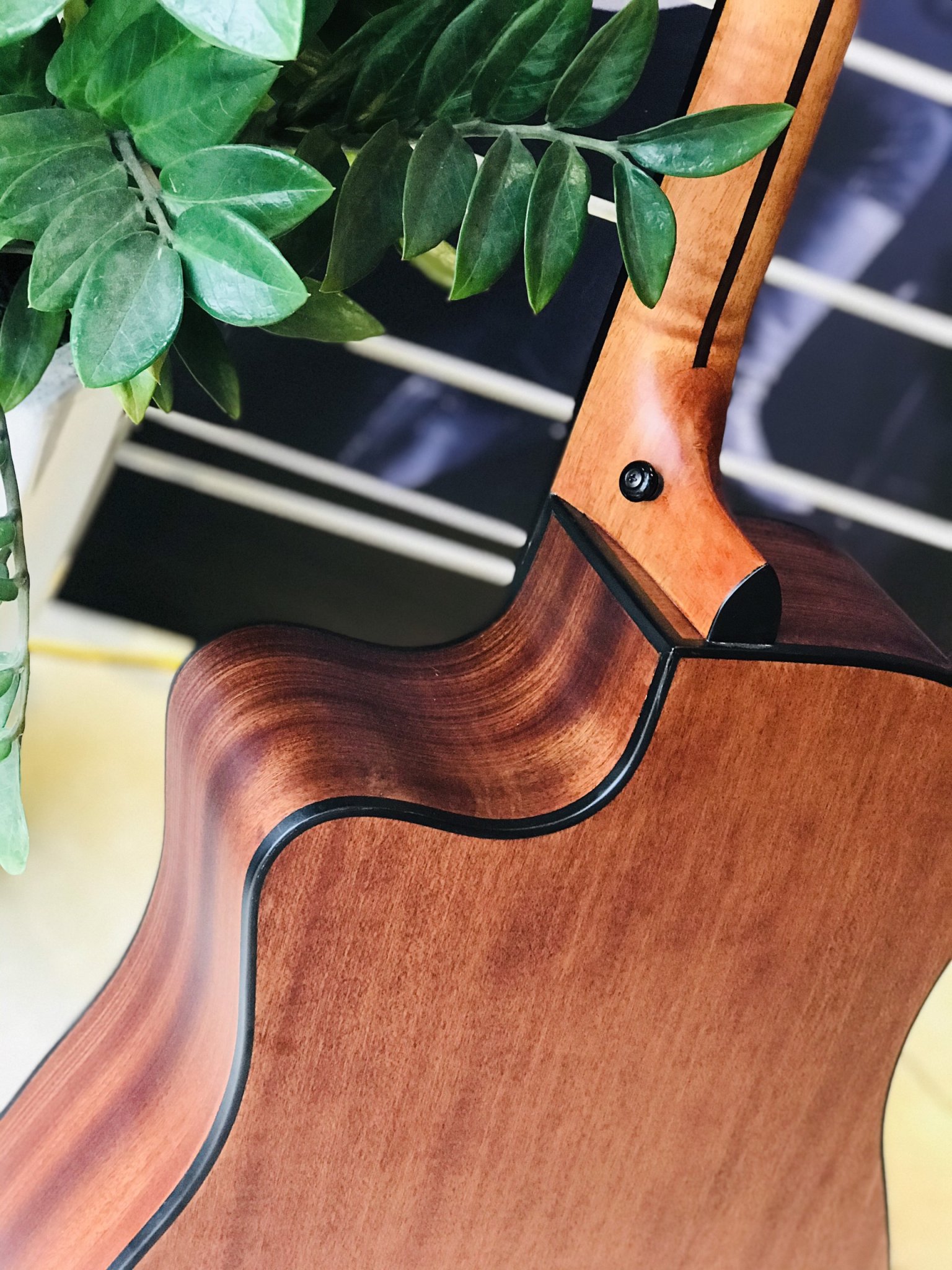 Guitar acoustic Hohner CS-DCESB có dáng khuyết được làm bằng gỗ gụ. Cây guitar này có một âm thanh ấm hơn so với các loại khác do sự kết hợp chung của gỗ gụ và