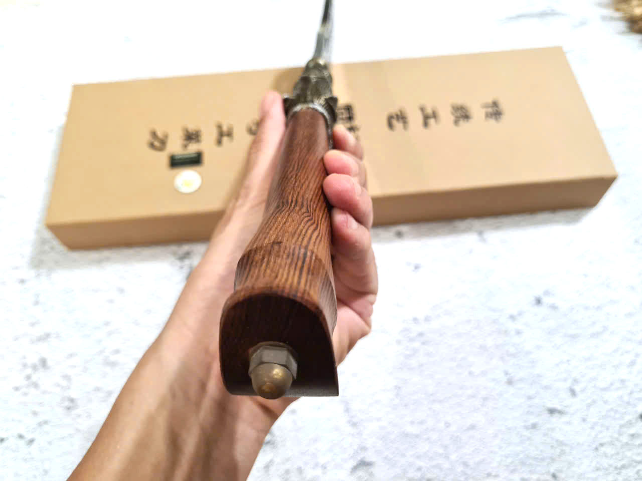 - Chức năng: Chặt xương ống, chân giò, trâu bò - Kích thước: Lưỡi: 22cm, cán: 10cm, rộng: 10cm, dầy: 5ly, trọng lượng: 800g - Cán : Gỗ mun, Khâu đồng đỏ , chốt đinh