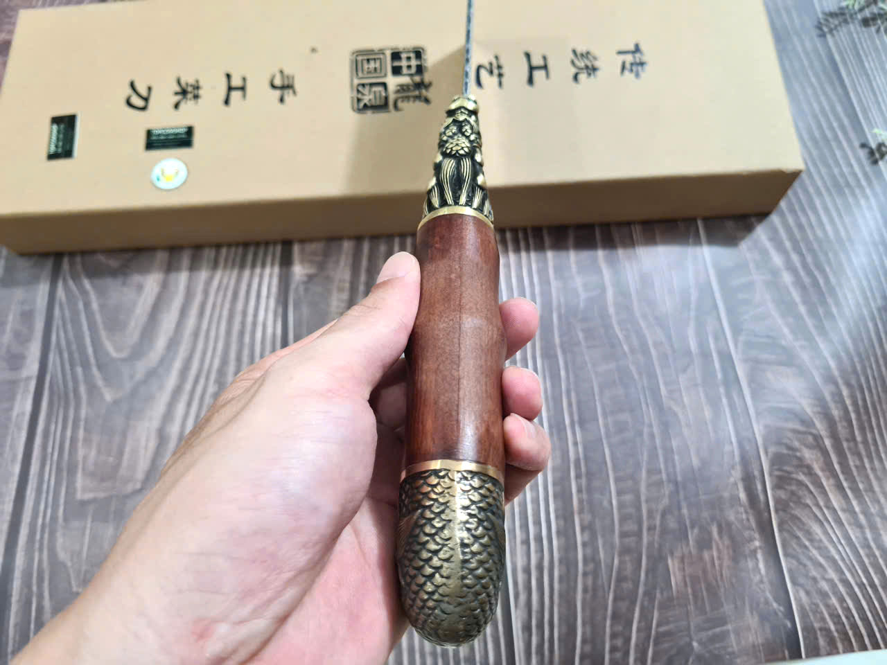 Chất liệu tay cầm: gỗ CẨM LAI, khâu và chuôi cuối dao bằng đồng thau