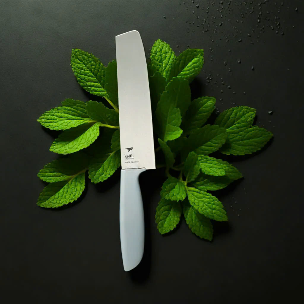 Dao bếp siêu nhẹ Titanium Keith Ti8743 được chế tạo bởi công nghệ kết hợp ba vật liệu bạc-titan-sứ, chỉ đứng sau độ cứng của kim cương, giữ cạnh tốt hơn, không mùi, không vị