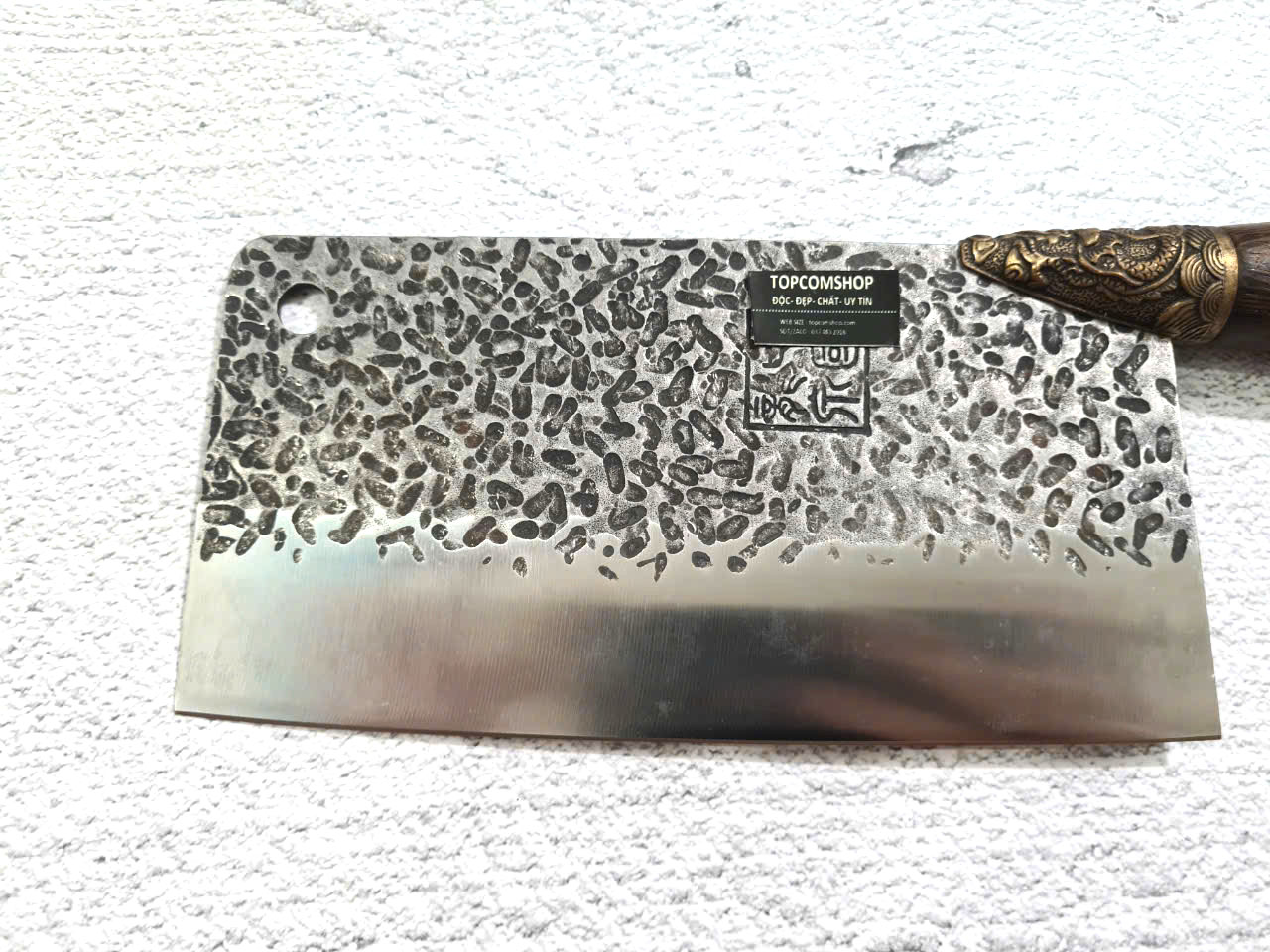 - Chức năng: Chặt xương ống, chân giò, trâu bò - Kích thước: Lưỡi: 22cm, cán: 10cm, rộng: 10cm, dầy: 5ly, trọng lượng: 800g - Cán : Gỗ mun, Khâu đồng đỏ , chốt đinh