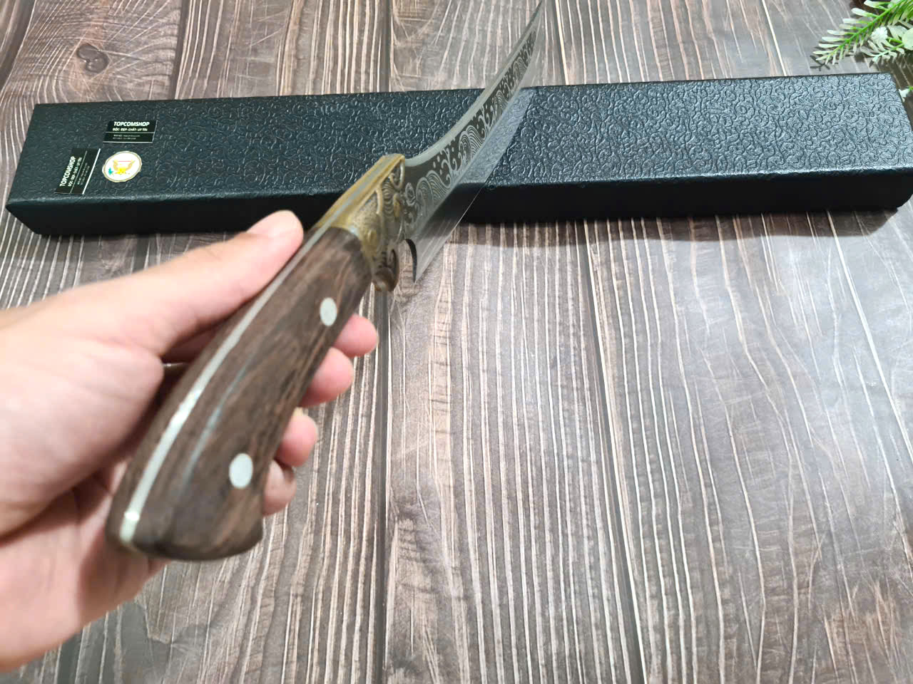 **** SASHIMI MÃ TR13 ều dài TỔNG: 37cm Chiều dài lưỡi: 23cm Chiều rộng lưỡi: 4.5cm, Độ dày lưỡi: 3mm Trọng lượng: 2.5 lạng chất liệu lưỡi : 7Cr17MOV (thép 7 crom 17 molypden vanadi) Chất liệu tay cầm: gỗ cẩm lai, phụ kiện khâu đầu hổ và chuôi bằng đồng
