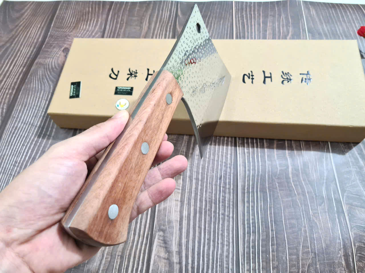 - Chức năng: Chặt xương ống, chân giò, trâu bò - Kích thước: Lưỡi: 22cm, cán: 10cm, rộng: 10cm, dầy: 5ly, trọng lượng: 800g - Cán : Gỗ mun, Khâu đồng đỏ , chốt đinh