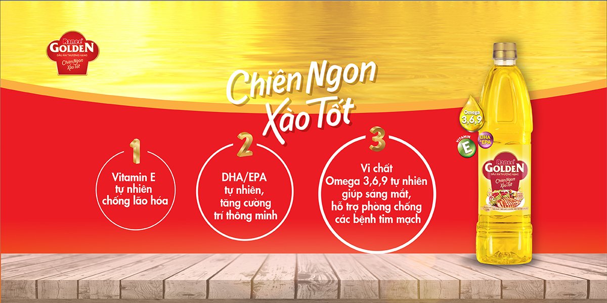 Dầu ăn thượng hạng Ranee Golden CHIÊN NGON XÀO TỐT Thành phần: + Dầu cá tinh luyện và dầu nành tinh luyện + Omega 3-6-9 và