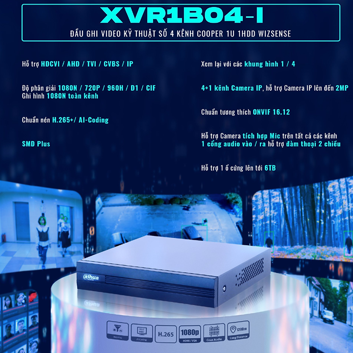 Thương hiệu: Dahua- Đầu ghi hình 4 kênh, hỗ trợ camera HDCVI/Analog/IP/TVI/AHD- Chuẩn nén hình ảnh H.265, độ phân giải 1080N/720P/960H/D1(1-25fps)- Hỗ trợ ghi hình tất cả các kênh 1080N- Cổng ra tín hiệu video đồng thời HDMI/VGA- Hỗ trợ xem lại 4 kênh đồng thời với chế độ tìm kiếm thông minh- Hỗ trợ kết nối nhiều nhãn hiệu camera IP(4+1)- Hỗ trợ lên đến camera 2.0 MegaPixel với chuẩn tương tích Onvif 16.12- Hỗ trợ 1 ổ cứng tối đa 6TB- Hỗ trợ 2 cổng usb 2.0, 1 cổng mạng RJ45(100M)- Hỗ trợ điều khiển quay quét 3D thông minh với giao thức Dahua- Hỗ trợ xem lại và trực tiếp qua mạng máy tính, thiết bị di động, hỗ trợ cấu hình thông minh qua P2P- Hỗ trợ Camera tích hợp Mic ghi âm tất cả các kênh, 1 cổng audio vào ra, hỗ trợ đàm thoại hai chiều- Quản lý đồng thời 128 tài khoản kết nối