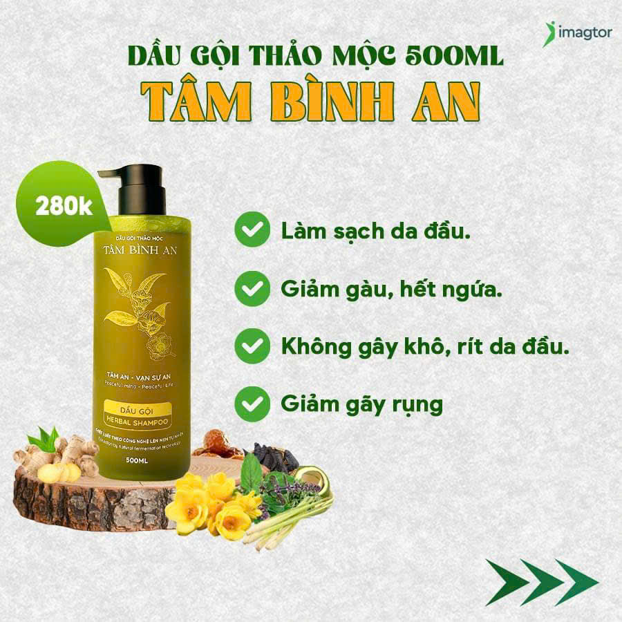 Mua tại TiktokMô tả: Dầu gội thảo mộc Tâm Bình An giữ tron tinh túy từ các nguyên liệu thiên, cung cấp dưỡng chất từ dược liệu quý Trà Hoa Vàng giàu chất EGCG chống oxy hóa, giảm viêm nhiễm, kích thích tuần hoàn máu, giảm ngứa, tóc mọc chắc khỏe, giảm gàu và mềm mượt. Giúp tóc và da đầu được bảo vệ bởi lớp màng ẩm và mang lại hương thơm thảo dược thiên nhiên. Ưu điểm: