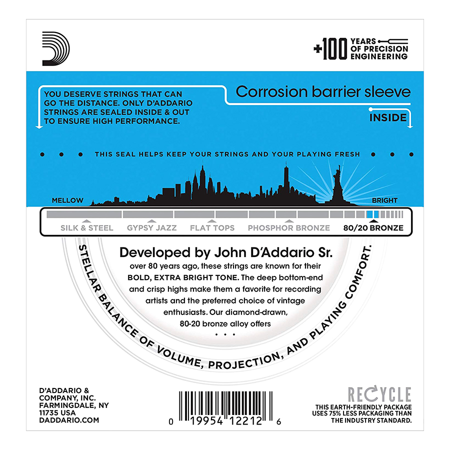 Mua tại TiktokDây Đàn Guitar Acoustic D'Addario EJ11 là dòng sản phẩm dây Bronze của hãng D'Addario (Mỹ), kích cỡ 12-53, loại Light. Đây là mẫu dây đàn guitar acoustic rất nổi tiếng và phổ biến, được người dùng đánh giá cao và được coi là một trong những bộ dây rất chất lượng dành cho đàn guitar acoustic. Dây đồng của D'Addario luôn có lõi dây làm bằng thép pha carbon, hình lục giác, chế tác bằng công nghệ hiện đại, độ bền cao, bao bì thân thiện với môi trường. Đặc biệt, dây guitar của hãng này chỉ sản xuất tại Mỹ (Made in USA). Dây guitar D'Addario cho âm thanh sâu và sáng, tạo thêm sự thăng hoa trong cảm xúc âm nhạc của bạn .
