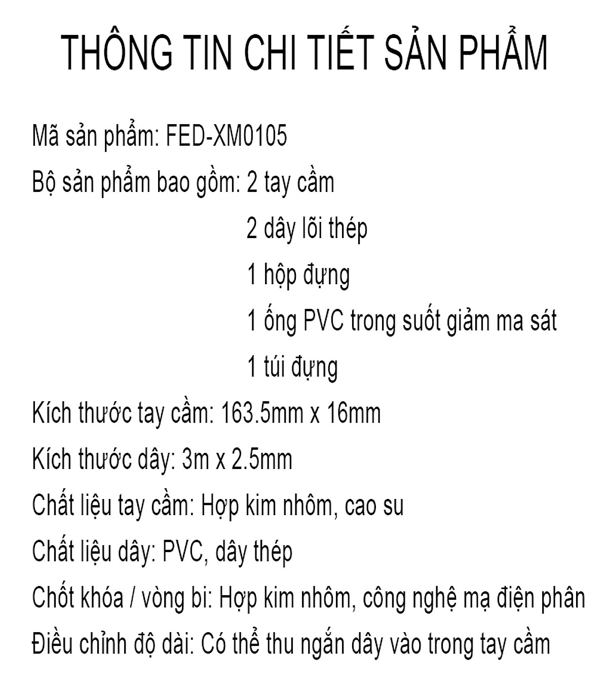 *THÔNG TIN CHI TIẾT VỀ DÂY NHẢY TẬP GYM FED-XM0105. - Mã sản phẩm: FED-XM0105. - Thương hiệu: FED. - Chất liệu Tay cầm: Hợp kim nhôm bọc cao su - CHất liệu dây: Lõi