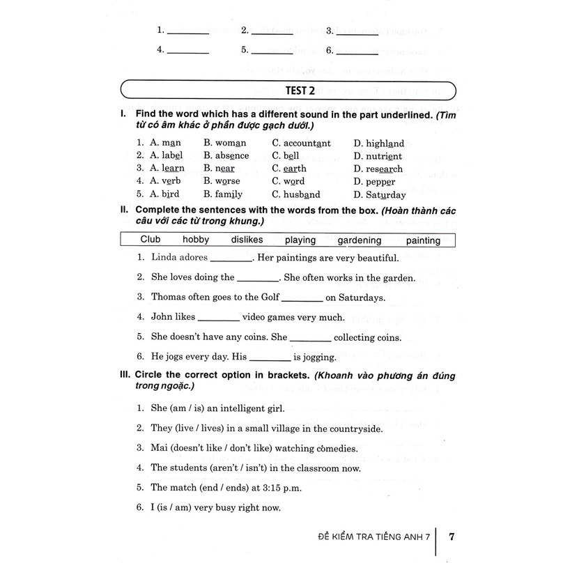 Sách bao gồm nhiều để kiểm tra với rất nhiều dạng khác nhau để các em luyện tập cách giải đề. Nội dung các đề kiểm tra bám sát các phần Ngữ âm, Từ vựng và Ngữ pháp, cũng như các chủ đề của mỗi bài học trong sách giáo khoa Tiếng Anh 7, hơn nữa còn được mở rộng thêm nên sẽ rất dễ dàng để các em vừa kiểm tra lại kiến thức đã học ở trường, vừa luyện tập và phát triển các kĩ năng phát âm, đọc, nói và viết.