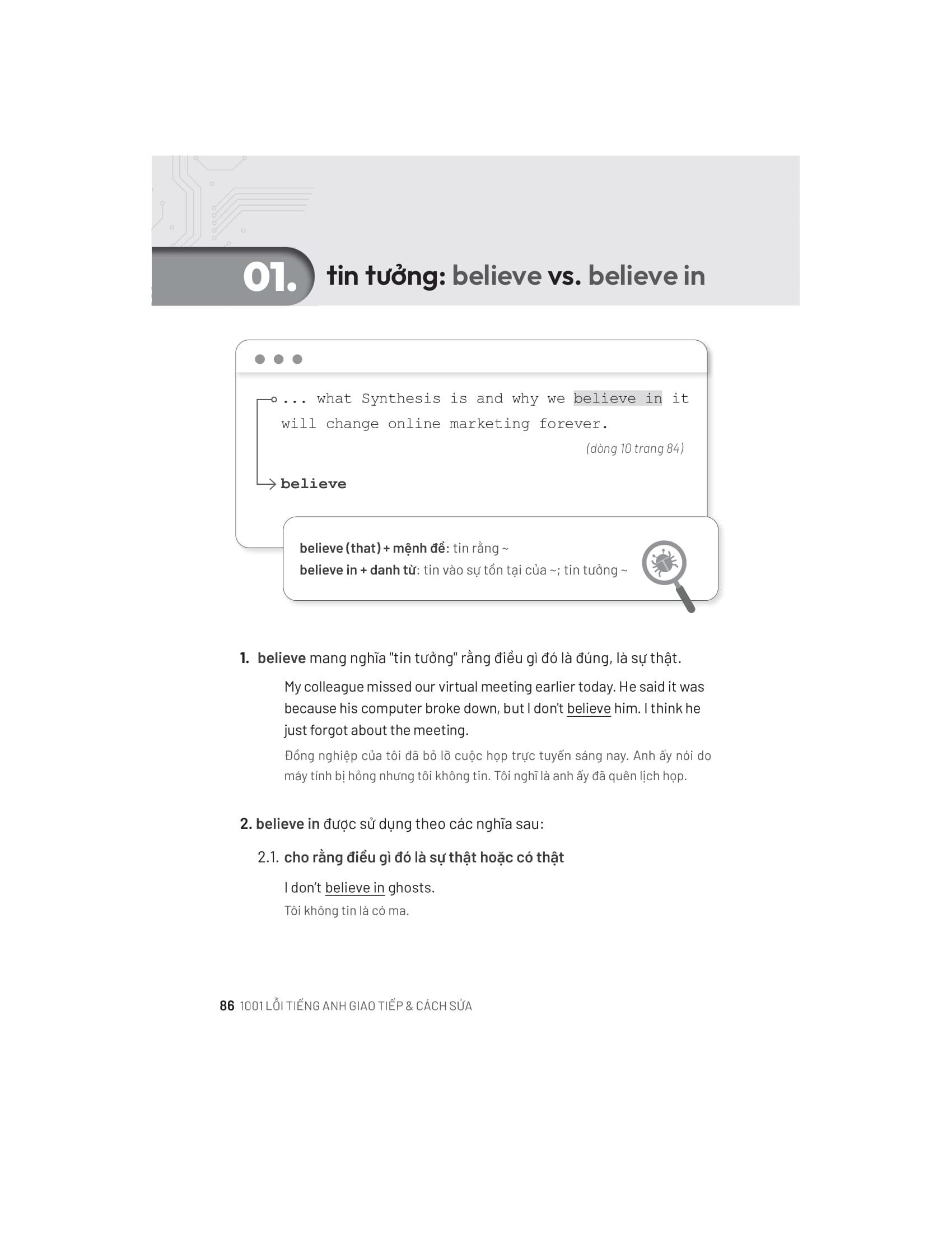 1001 lỗi tiếng Anh giao tiếp & cách sửa – Debug your English là cuốn sách tổng hợp các lỗi sai phổ biến mà người học tiếng Anh thường mắc và chia thành các nhóm lỗi lớn như lỗi dùng sai giới từ, lỗi ngữ pháp, lỗi dùng từ, lỗi diễn đạt thiếu tự nhiên. Từ các tình huống giao tiếp thực tế trong công việc, sách chỉ ra các lỗi sai và đề xuất cách sửa, giải thích sắc thái của từ, đồng thời cung cấp thông tin mở rộng và ví dụ ứng dụng.