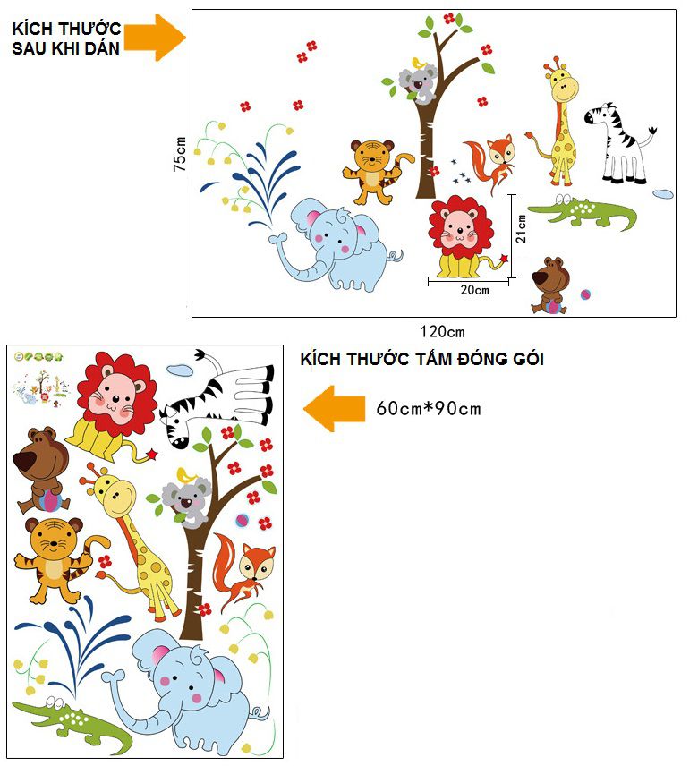 Decal dán tường Combo Vườn thú có màu sắc tươi sáng, vui nhộn. Decal với các hoạ tiết nhân vật hoạt hình, đem lại cảm giác như những người bạn thân thiết của bé ngay trong