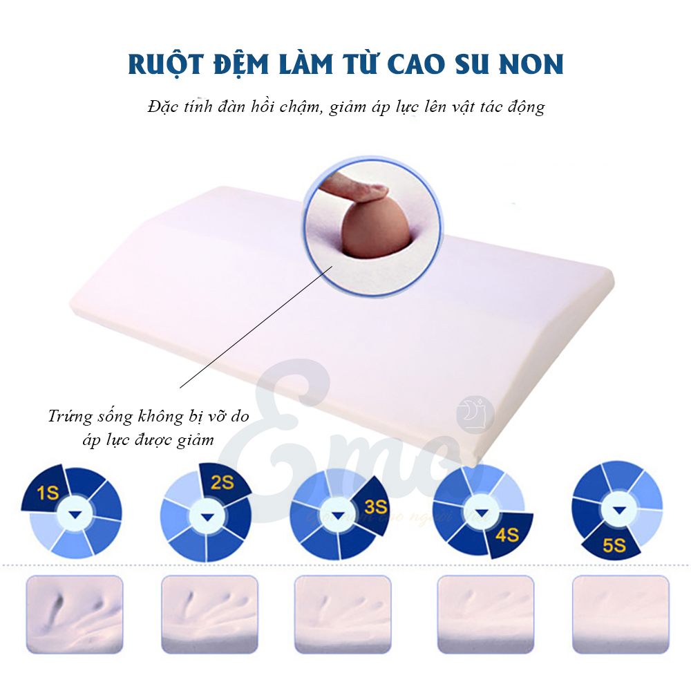 Ruột gối: Được làm từ 100% cao su non với đặc tính đàn hồi chậm, giúp lấp đầy một cách êm ái vùng thắt lưng khi bạn nằm lên, từ đó giảm áp lực và giảm đau lên khu vực này.