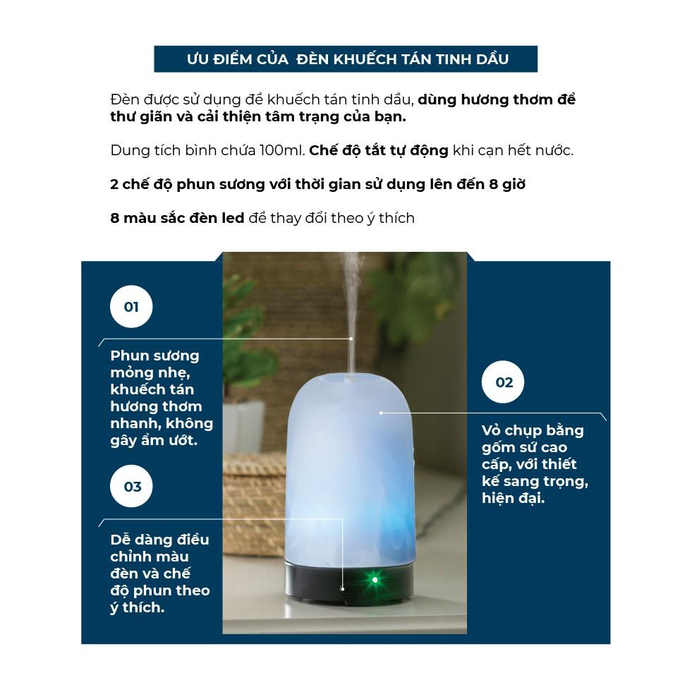 Khả năng khuếch tán tinh dầu tốt, giúp hương thơm lan tỏa nhanh. Sử dụng như một thiết bị cung cấp độ ẩm cho không khí, giảm khô da mà không gây ảnh hưởng đến