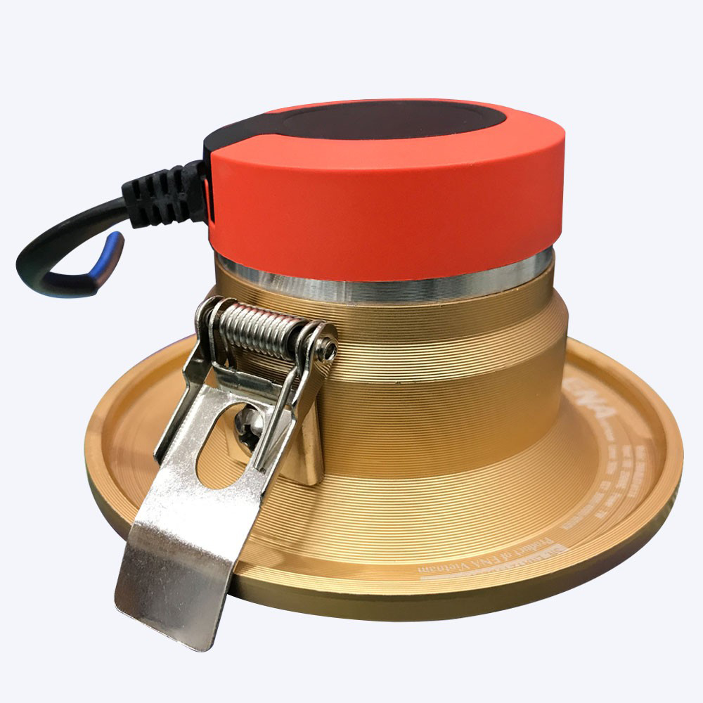 Đèn LED Âm trần Downlight 110/9W Viền Vàng Model: AT10 110/9W (G) Công suất: 9W Điện áp: 220V/50-60Hz Quang thông: 900lm Nhiệt độ màu: 6500K/3000K Kích thước (ØxH): (138x36)mm ĐK lỗ khoét trần: 110mm Sử