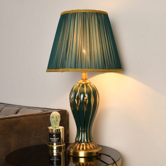 Chắc hẳn chúng ta đã quá quen thuộc với hình ảnh chiếc đèn bàn tạo điểm nhấn cho không gian phòng khách. Chúng còn là mẫu đèn trang trí được yêu thích nhất và cung cấp ánh sáng tốt cho những phút giây chúng ta thư giãn, nghỉ ngơi trong phòng ngủ. Phòng khách luôn được coi là bộ mặt của một căn nhà, vì vậy các vật dụng nhằm mục đích trang trí cũng được đầu tư kĩ lưỡng, tốn khá nhiều chi phí. Bên cạnh hệ thống chiếu sáng chính như đèn tuýp, đàn mâm, đèn âm trần,… chỉ với một chiếc đèn để bàn sẽ nâng tầm không gian. Bạn hãy đặt sản phẩm bên cạnh sofe, kệ tivi để hoàn thiện thêm vẻ đẹp tinh tế, sang trọng và đẳng cấp của căn phòng, cũng như toàn bộ ngôi nhà của gia đình. Thân đèn là bình gốm sứ cao cấp đã trải qua quá trình nung ở nhiệt độ cao đem đến chất lượng tuyệt hảo, trên đó được tô vẽ bằng những hoa văn, đường nét thật nhẹ nhàng nhưng cũng thật quyến rũ lòng người.  Kết hợp với chụp đèn màu xanh bằng vải lụa giúp chống thấm nước và đem đến ánh sáng êm dịu, ấm áp cho người sử dụng. Thiết kế không mang hoa văn sặc sỡ, không cầu kỳ rườm rà, màu sắc trang nhã thanh lịch thôi đã đủ làm nổi bật cả không gian. Đế đèn hợp kim được mạ lớp sơn tĩnh điện màu vàng Pháp không chỉ giúp sản phẩm tăng thêm vẻ sang trọng mà còn tạo độ bền cao hơn cho sản phẩm. Hãy đặt nó trong không gian phòng khách để tạo điểm nhấn sang trọng và ấm áp cho không gian. Hay như trên tủ đầu giường nơi phòng ngủ, sử dụng bóng đèn công suất nhỏ và ánh sáng vàng dịu nhẹ sẽ đem đến cảm giác thoải mái, thư thái từ đó nâng cao chất lượng giấc ngủ, cải thiện tinh thần. Ngoài ra, chúng có thể đặt trên bàn làm việc, bàn đọc sách trang hoàng không gian thềm ấn tượng. Cùng với đó là sử dụng bóng đèn ánh sáng trắng hoặc vàng có công suất lớn hơn trong phòng ngủ sẽ cung cấp nguồn ánh sáng cần thiết để làm việc, học tập có hiệu quả. Ngoài ra, bạn muốn tìm cho phòng ngủ yên tĩnh của ra đình mẫu đèn có ánh sáng êm dịu, thoải mái bên cạnh nguồn sáng chính. đèn bàn mang tới ánh sáng ổn định, ấm áp, dịu nhẹ, giúp chúng ta thêm ngon giấc. Do đó nhu cầu sử dụng đèn để bàn tròng phòng ngủ ngày càng tăng cao. Có thể coi đèn bàn trang trí là một trong những thiết bị chiếu sáng phù hợp trong rất nhiều không gian của gia đình. Với ánh sáng tập trung không chỉ làm nổi bật không gian xung quanh mà còn mang đến ánh sáng thích hợp cho việc học tập, nghỉ ngơi, làm việc.