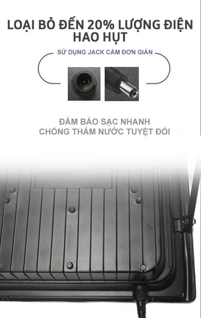 Thời gian chiếu sáng: 10-12h/ngày Thời gian nạp: 3-4 tiếng ( tùy mức độ nắng) Tuổi thọ đèn: 5 năm Dung lượng Pin: 25000mah Kích thước tấm pin: 530x350x17mm Đầu vào tấm Pin: 20W Thân