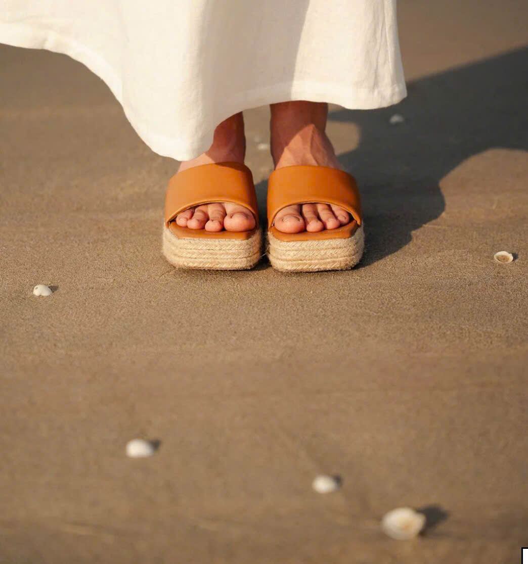 - Phần đế xuồng được viền cói (espadrille) tỉ mỉ, không chỉ tạo điểm nhấn tự nhiên, mộc mạc mà còn giúp "ăn gian" chiều cao một cách khéo léo, mang lại vóc dáng thanh thoát và uyển chuyển.