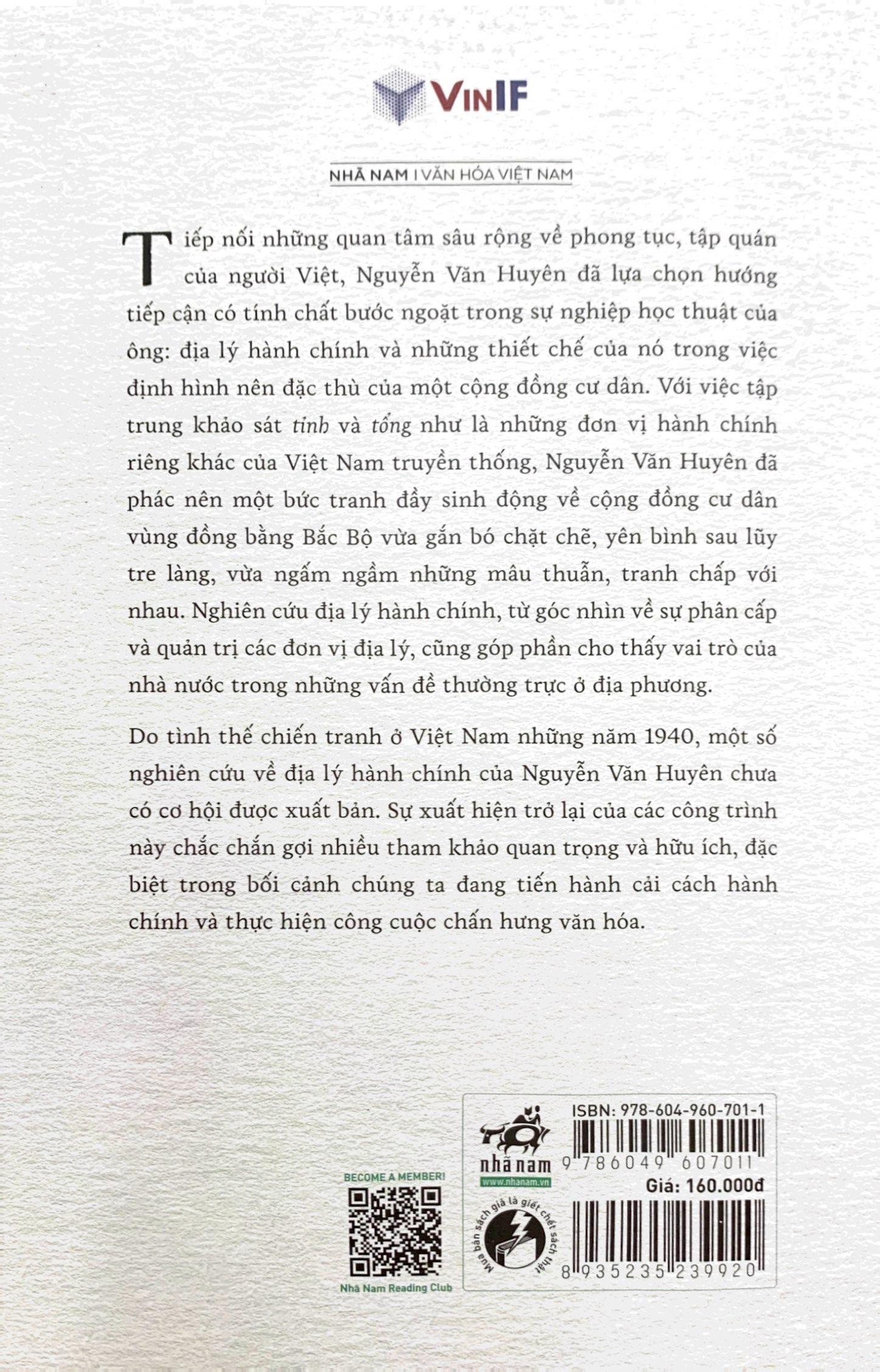 Địa Lý Hành Chính Và Tập Quán Người Việt Cùng 2 Di Cảo Chưa Từng Công Bố CÔNG TRÌNH NGHIÊN CỨU ĐẦY TINH TẾ VỀ PHONG TỤC TẬP QUÁN CỦA NGƯỜI VIỆT - KÈM THEO HAI DI CẢO CHƯA TỪNG ĐƯỢC CÔNG BỐ CỦA TÁC GIẢ NGUYỄN VĂN HUYÊN! Trong cuốn sách này, tác giả đã phác nên một bức tranh hết sức sinh động về cộng đồng cư dân vùng đồng bằng Bắc bộ vừa gắn bó chặt chẽ, yên bình sau lũy tre làng, vừa ngấm ngầm những mâu thuẫn, tranh chấp với nhau. Địa lý hành chính, dưới góc nhìn là sự phân cấp và quản trị các đơn vị địa lý, cũng góp phần cho thấy vai trò của nhà nước trong các vấn đề thường trực của địa phương. Những nghiên cứu đầy giá trị của Nguyễn Văn Huyên trước đây chưa có cơ hội được xuất bản bởi tình hình chiến tranh tại Việt Nam những năm 1940. Vậy nên, sự xuất hiện trở lại của các công trình này hy vọng sẽ góp phần mang tới cho các bạn độc giả những tham khảo quan trọng, cũng như những phát hiện thú vị về phong tục, tập quán của người Việt.