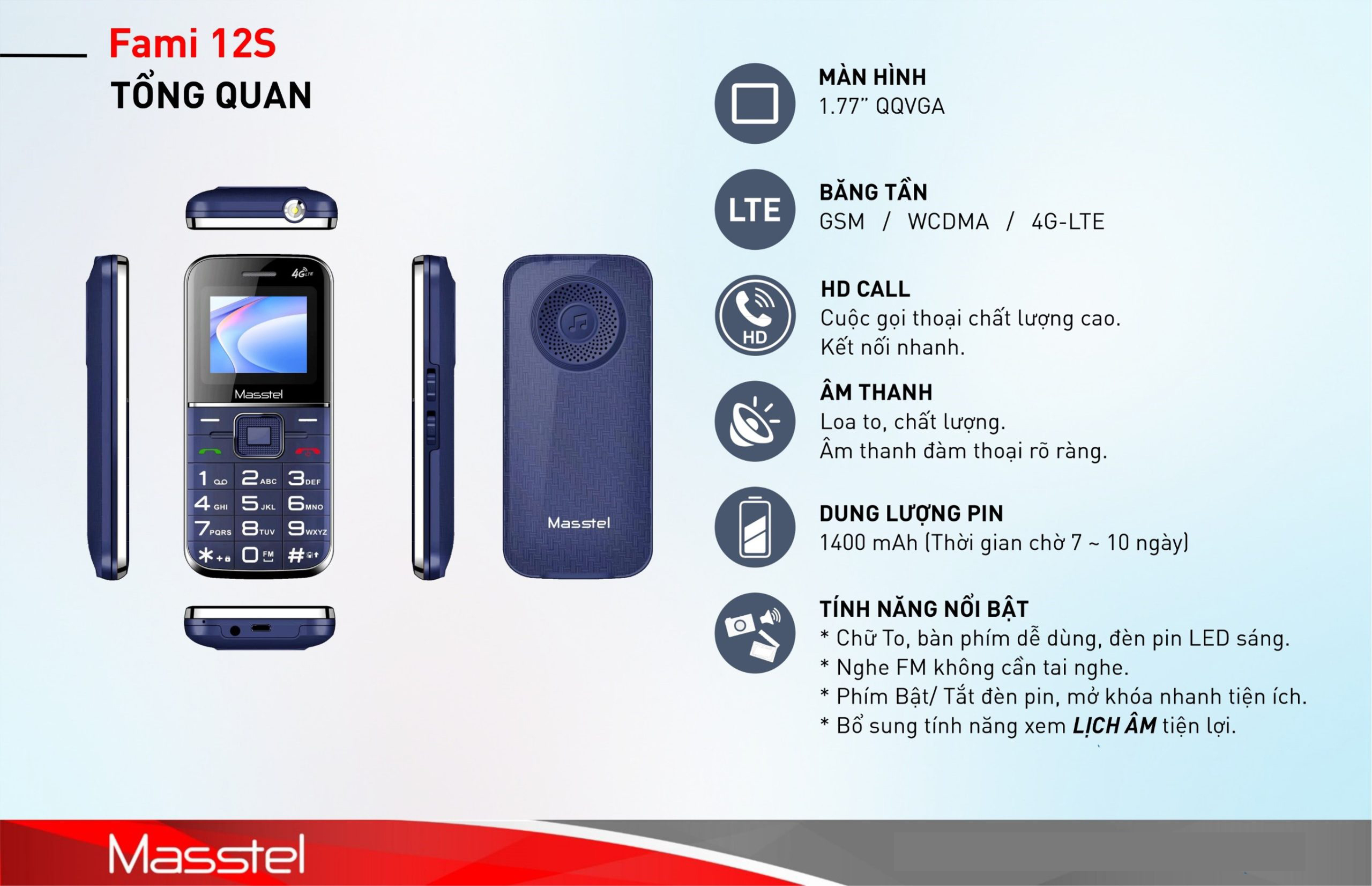 Điện Thoại Người Già Masstel Fami 12 4G, Viền Kim Loại, Pin Trâu, Truy Cập Internet 4G, FM Không Dây