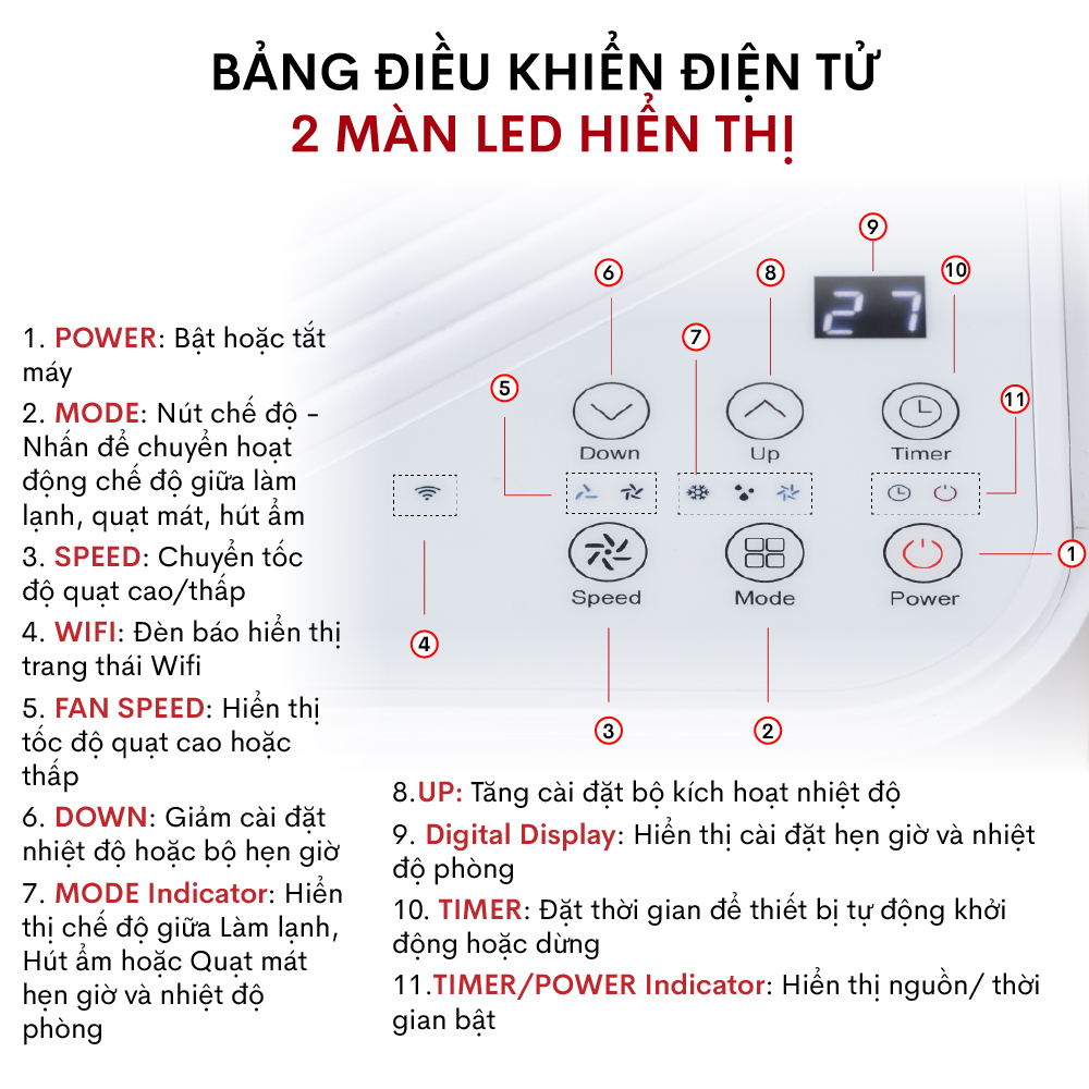 - Hút ẩm trong điều kiện trời nồm Máy điều hòa di động có thể được sử dụng như một máy hút ẩm thực thụ với công suất hút ẩm lên đến 35 lít/ngày, có thể thoát nước thải liên tục qua ống hoặc xuống bình chứa bên dưới máy (dung tích 0.6 lít) Khả năng kết nối wifi, điều khiển từ xa qua internet Thông qua ứng dụng App có thể tải xuống miễn phí trên Google Play hoặc App Store, người dùng hoàn toàn có thể kết nối điều hòa máy điều hòa , với các thiết bị di động để điều khiển máy từ xa. Những thao tác như bật/tắt thiết bị, chuyển đổi chức năng, hẹn giờ mở máy…trở nên hết sức đơn giản khi bạn sử dụng App để điều khiển máy, Đồng thời máy cũng được trang bị điều khiển từ xa tiện lợi, thông minh. Hoạt động bền bỉ, tiếng ồn nhỏ