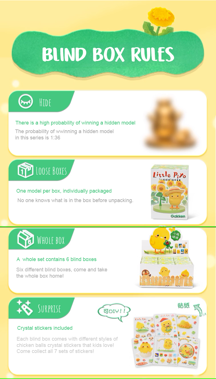 Thương hiệu: Gakken Shanghai Xuất xứ thương hiệu: Nhật Bản Kích thước: 70*70*100 mm Chất liệu: Nhựa PVC Đồ chơi hộp mù - Gà con Piyo là một sản phẩm đáng yêu và tương tác