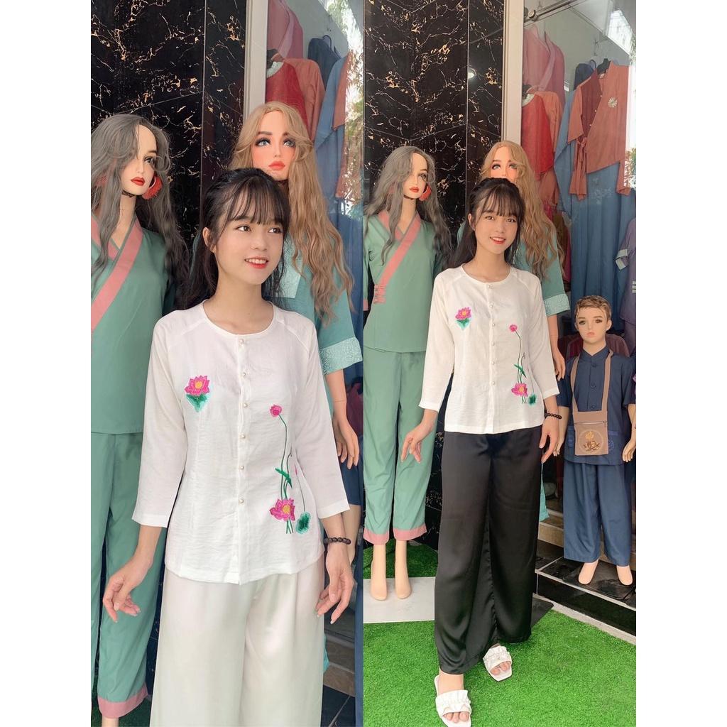 Đồ lam đi chùa - áo xống đi chùa - Đồ lam phật tử - Bộ đồ đi lễ chùa thêu sen cổ tàu (Ảnh + Video cửa hàng tự quay)