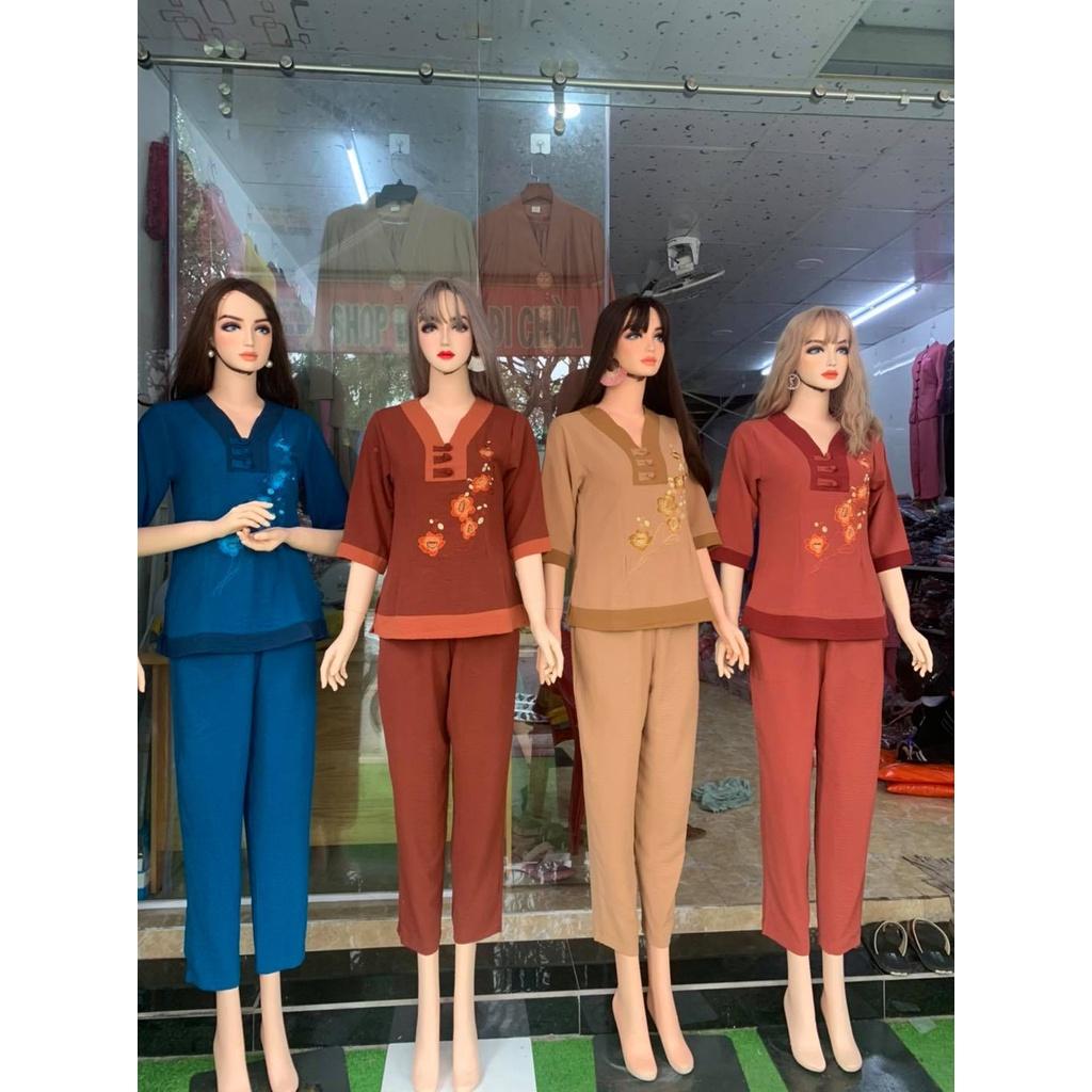 Đồ bộ đi chùa vải đủi vân may thêu hoa sen và chữ An