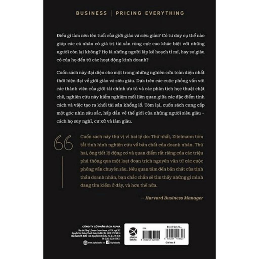 Cuốn sách nhằm mục đích lấp đầy những khoảng trống trong nghiên cứu về sự giàu có, mối tương quan giữa các đặc điểm tính cách cụ thể và sự thành công của doanh nhân. Tác giả đã thực hiện 45 cuộc phỏng vấn với những cá nhân có giá trị tài sản ròng từ 10 triệu đến 30 triệu EUR ở nhóm thấp nhất, lên đến hàng trăm triệu, thậm chí vài tỉ EUR ở nhóm cao nhất. Phần A của cuốn sách, trong đó trình bày chi tiết tình hình nghiên cứu học thuật hiện nay trong lĩnh vực này, sẽ giúp người đọc hiểu được cách xây dựng các câu hỏi cho cuộc phỏng vấn. Phần này vạch ra những khoảng trống đang tồn tại trong việc nghiên cứu, xây dựng các câu hỏi và mô tả phương pháp nghiên cứu. Chương 1 bàn tới thực trạng nghiên cứu học thuật về sự giàu có, tổng hợp lại những phát hiện quan trọng nhất và vạch ra những lỗ hổng trong nghiên cứu. Chương 2 đánh giá cách sử dụng và định nghĩa của thuật ngữ "giới tinh hoa kinh tế" trong nhiều nghiên cứu về giới tinh hoa. Những nghiên cứu trước đây về giới tinh hoa kinh tế đã quá chú trọng vào các thành viên điều hành được tuyển dụng vào các vị trí lãnh đạo trong khi gần như hoàn toàn bỏ qua các doanh nhân độc lập và các nhà đầu tư. Có những lí do chính đáng để chia tầng lớp tinh hoa kinh tế thành hai nhóm. Chính những người giàu có kiệt xuất, một phân nhóm riêng biệt trong giới tinh hoa kinh tế, là chủ đề của tác phẩm này. Chương 3 mô tả thực trạng của nghiên cứu tinh thần doanh chủ. Ngay từ đầu thế kỉ XX, các tác giả khám phá hiện tượng khởi nghiệp, nổi bật nhất là Werner Sombart và Joseph Schumpeter, đã nhấn mạnh tầm quan trọng của các vấn đề tâm lý. Ngày nay, các nghiên cứu về tâm lý của doanh nhân, đặc biệt là ở Hoa Kỳ, rất đa dạng và sẽ được thảo luận trong mục 3.2. Phần này tập trung vào những phát hiện quan trọng của nghiên cứu về tính cách các doanh nhân. Chương 4 đề cập đến kinh tế học hành vi và các thuyết học tập, trong chừng mực chúng có liên quan đến thành công của doanh nhân. Chúng bao gồm cả học tập "chủ động" và "vô thức". Học tập vô thức, nền tảng của "tri thức ẩn", đóng một vai trò đặc biệt quan trọng đối với các doanh nhân, như các nghiên cứu hiện nay đã chỉ ra và điều đó cũng được khẳng định rõ ràng qua cuộc phỏng vấn với các UHNWI được trình bày trong cuốn sách này. Chương 5 xem xét vai trò của cơ hội hoặc "may rủi". Cả hai yếu tố này thường được các cá nhân thành công đề cập đến, và có những nghiên cứu cho rằng chúng có vai trò lớn hơn nhiều so với thực tế thấy được từ cuốn sách này. Liệu có những nguyên nhân nào về mặt xã hội và tâm lý để lí giải việc những người thành công thường nhấn mạnh vào may rủi hay cơ hội? Chương 6 xem xét các lí thuyết về tính cách, đặc biệt tập trung vào những đặc điểm tính cách theo thuyết Năm Nhân tố. Chương này cũng thảo luận về lí do vì sao trong các cuộc phỏng vấn, tác giả lại khám phá những đặc điểm khác ngoài những đặc điểm mà lí thuyết Năm Nhân tố đã xác định, chẳng hạn như xu hướng rủi ro. Chương 7 tập trung vào phương pháp luận. Đầu tiên, chương này cung cấp một cái nhìn tổng quan về các phương pháp tiếp cận có thể có đối với phỏng vấn định tính, tiếp theo là giải thích về việc lựa chọn phỏng vấn có định hướng làm mô hình phù hợp nhất cho nghiên cứu này. Ngoài ra, vấn đề về khuynh hướng phản ứng theo mong đợi của xã hội như đã đề cập ở trên, thường được đánh giá thấp trong các nghiên cứu về doanh nhân và giới tinh hoa, cũng sẽ được thảo luận cụ thể. Cuối cùng, Phần B đưa ra đánh giá về 45 cuộc phỏng vấn với các UHNWI. Nội dung bao quát này được sắp xếp theo chủ đề. Các câu trả lời nguyên văn của đối tượng phỏng vấn được trình bày đầy đủ, bởi vì một trong những mục tiêu chính của nghiên cứu này là truyền tải lại nguyên vẹn quan điểm của những đối tượng phỏng vấn, đồng thời có được cái nhìn chân thực nhất có thể về cách tư duy và khuôn mẫu hành vi của họ. ĐÁNH GIÁ VỀ CUỐN SÁCH Thông tin/ Đánh giá về bản gốc: hiệu ứng truyền thông, tầm ảnh hưởng của cuốn sách, giá trị mang lại/ độ phù hợp độc giả Việt Trích đánh giá của chuyên gia, tổ chức uy tín về cuốn sách "Rainer Zitelmann làm được điều gần như chưa nhà nghiên cứu nào trước ông có thể: Luận án tiến sĩ của ông hé lộ những bí mật về giới siêu giàu ở Đức, khám phá thế giới vốn chưa từng được công chúng biết đến của những triệu phú và triệu triệu phú. Zitelmann đã thực hiện các cuộc phỏng vấn chuyên sâu với 45 triệu phú và tỉ phú… và thật vô cùng thú vị khi được đọc về cách cha mẹ họ đối phó với chủ đề tiền bạc” - Tạp chí FOCUS MONEY-Online “Cuốn sách của Zitelmann có tầm quan trọng lớn vì nó cung cấp lời giải thích cho sự thà