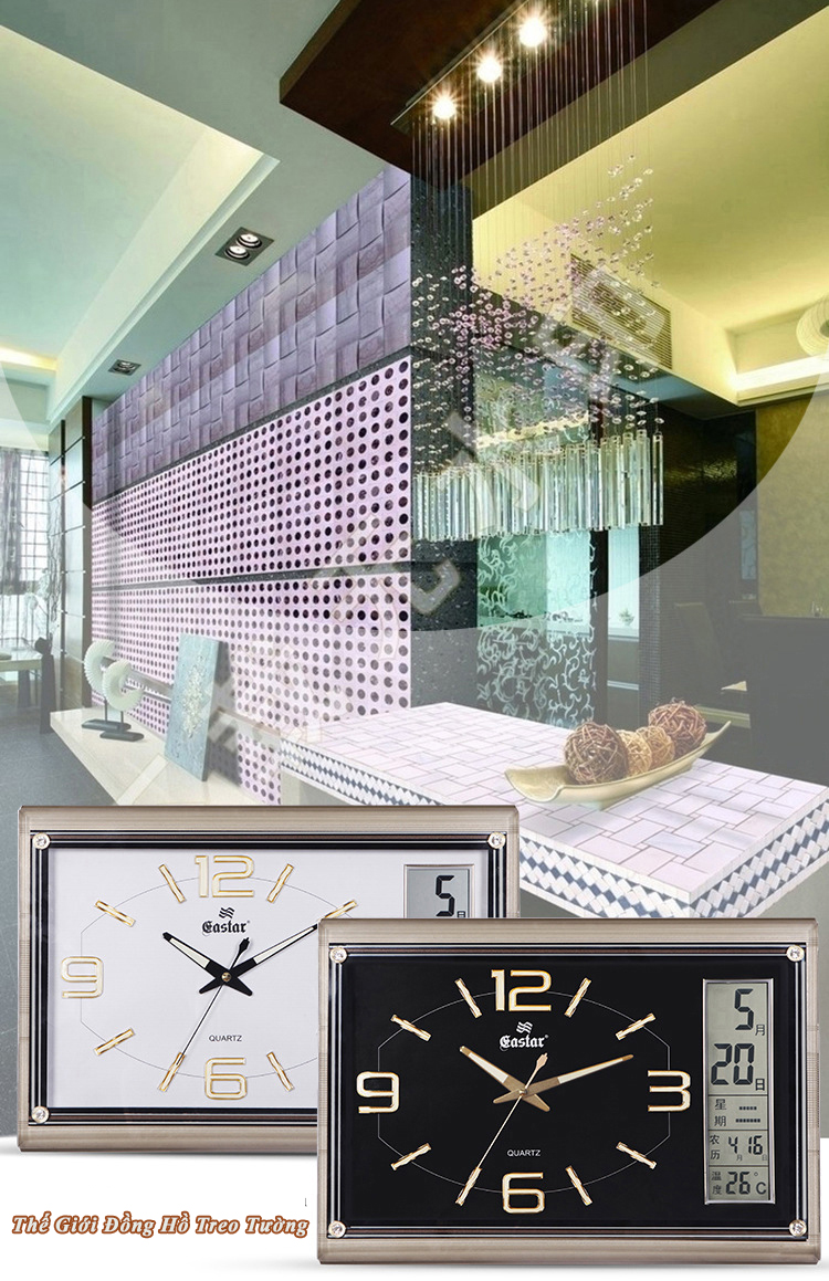 - Đồng Hồ Treo Tường Cao Cấp EASTAR Kim điện tử, Dạ quang, Đồng hồ Lịch Vạn Niên và Nhiệt kế hình Chữ nhật, Mặt kính Nổi, hiện đại, sang trọng.