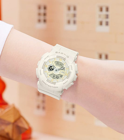 Tự thưởng cho mình mẫu đồng hồ BABY-G màu sô cô la lấy cảm hứng từ hương vị sô cô la bạn yêu thích. Chiếc đồng hồ đơn sắc màu trắng nhạt phủ lớp hoàn thiện mờ, làm bạn liên tưởng ngay đến viên sô cô la trắng thơm ngon cao cấp. Mẫu đồng hồ không chỉ ngon mắt mà còn có tính thực tiễn cao với cấu trúc chống va đập và khả năng chống nước ở độ sâu 100 mét.
