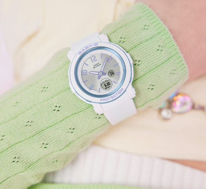 Thỏa mãn vị giác với mẫu đồng hồ BABY-G màu kẹo. Vỏ và dây đeo đẹp mắt phủ lớp hoàn thiện mờ kết hợp với đường gờ và vạch chỉ giờ bằng nhựa resin trong