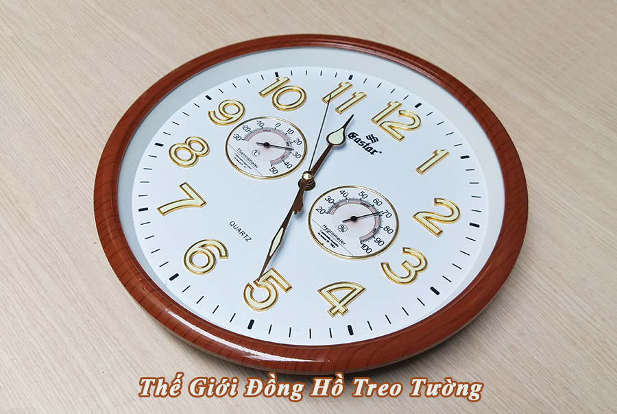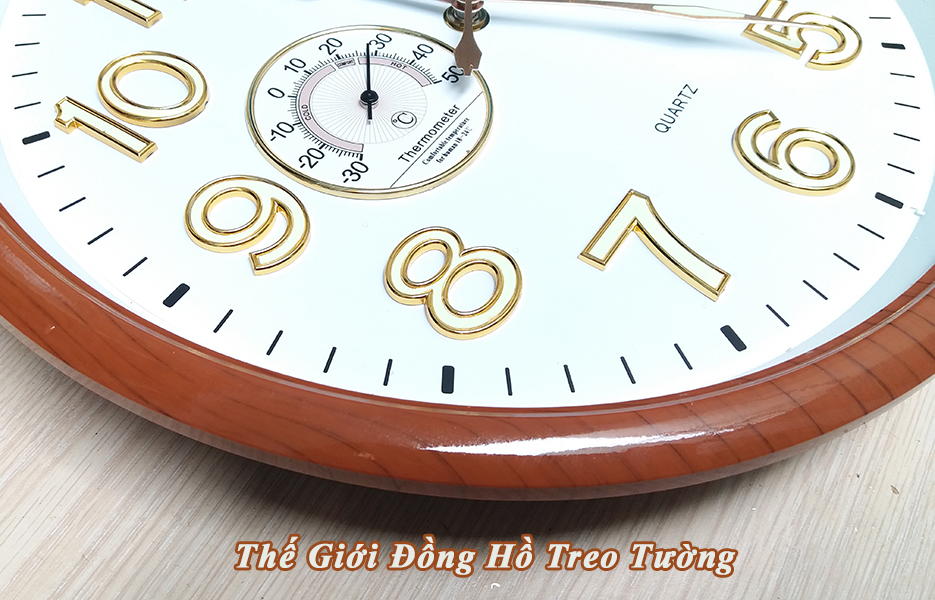 • Đồng hồ Kim trôi số nổi 3D có Dạ Quang và Nhiệt ẩm kế Cơ hình tròn kiểu dáng hiện đại, Viền kiểu Vân Gỗ với đường kính lên tới 32,5 cm, dày 4,5 cm.