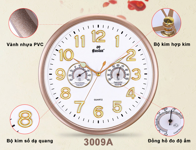 (*) Nhiệt ẩm kế tự động sử dụng nguyên lý co dãn của lò so kim loại dựa trên điều kiện thời tiết để hiển thị nhiệt độ và độ ẩm xung quanh nơi treo đồng hồ. Không nên sử dụng cho mục đích khác. Đây cũng không phải là dụng cụ nhiệt ẩm kế chuyên dụng. Mức sai số của Nhiệt kế là ± 2oC. Mức sai số của Ẩm kế là ± 10%.