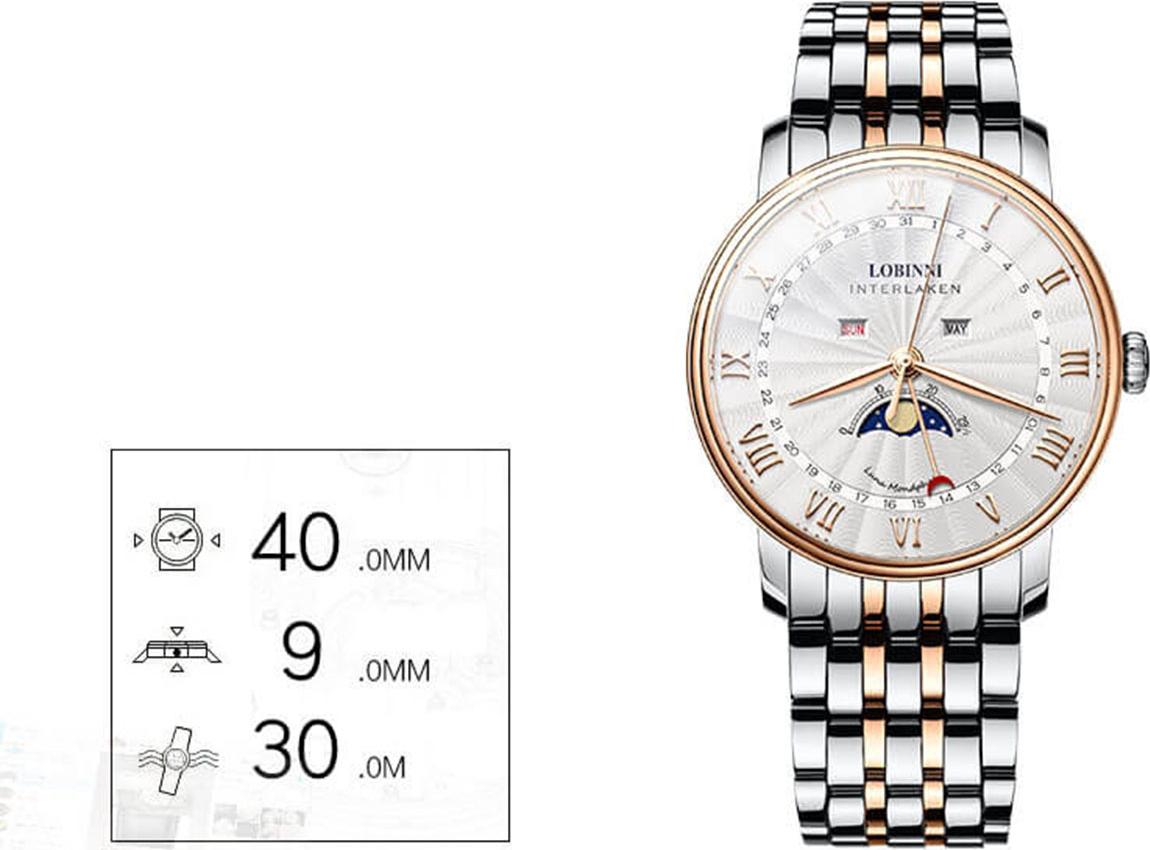 Lobinni No.3604 không chỉ hỗ trợ người dùng ở việc xem thời gian cơ bản mà còn trang bị thêm nhiều chức năng như lịch thứ, lịch ngày, lịch moon phase