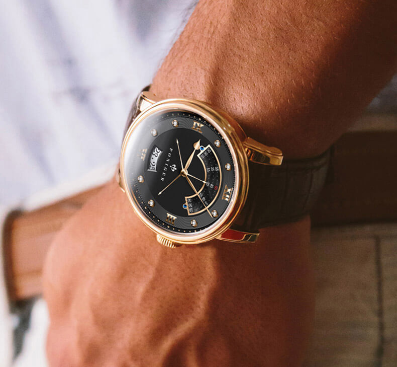 Đồng hồ Thụy Sĩ luôn mang lại cho người dùng một khoái cảm đặc biệt về cả diện mạo lẫn chất lượng. Như chiếc Poniger này, đẳng cấp thể hiện qua dòng chữ "SWISS MADE" được in trên mặt số. Bên cạnh đó còn là: