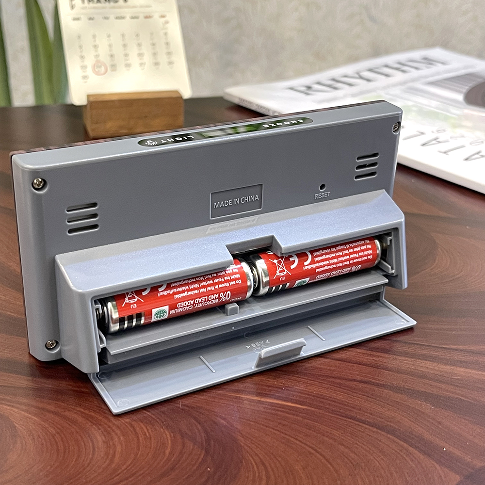 Mua tại TiktokĐồng hồ để bàn báo thức Rhythm LCT108NR06 – Kích thước 13.1 x 6.6 x 3.6cm, trọng lượng 150g. Vỏ nhựa vân gỗ. Dùng 2 Pin tiểu ( AA x 2). Màn hình tinh thể lỏng LCD tự động bật sáng trong tối ( màu cam nhạt – Auto Light On In The Dark). Hiển thị ngày, thứ, tháng bằng 8 thứ tiếng ( Anh , Đức, Pháp, Italy, Tây Ban Nha, Đan Mạch, Nga, ), Nhiệt độ , độ ẩm môi trường. Báo thức 4 cấp độ âm lượng tăng dần. Báo thức lập lại ( Snooze) chống ngủ nướng. Có đèn Led xem giờ trong tối bằng cảm ứng chạm mặt kính đồng hồ. ( Touch Sensor )