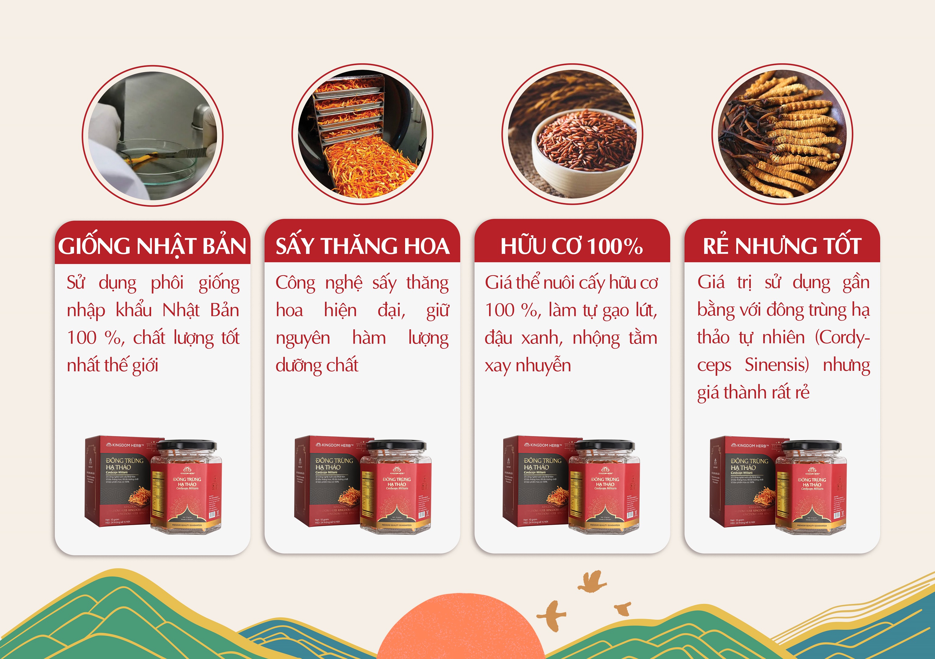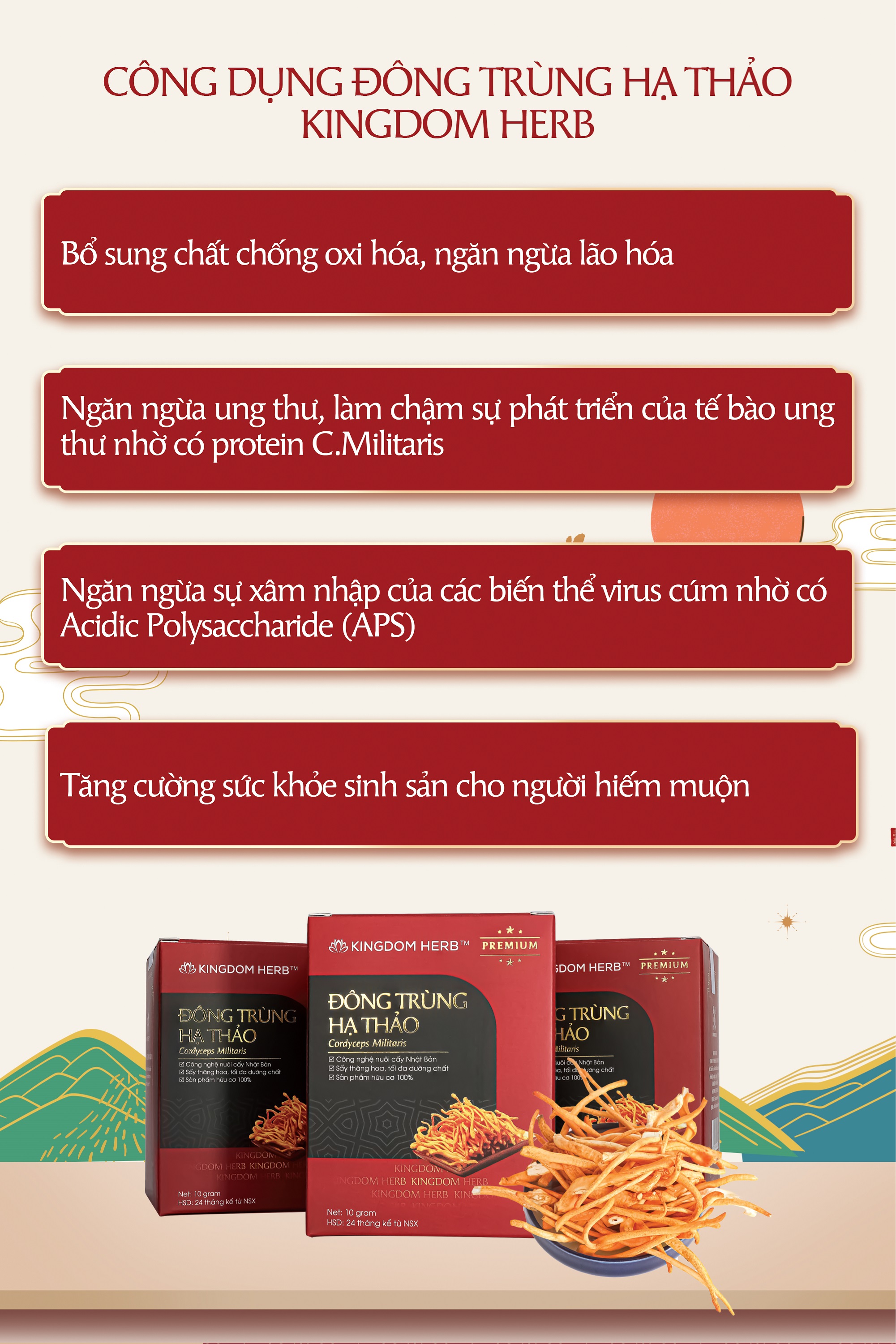 - Tăng cường sức khỏe sinh sản cho người bị hiếm muộn Cam kết của nấm đông trùng hạ thảo sấy thăng hoa Kingdom Herb:
