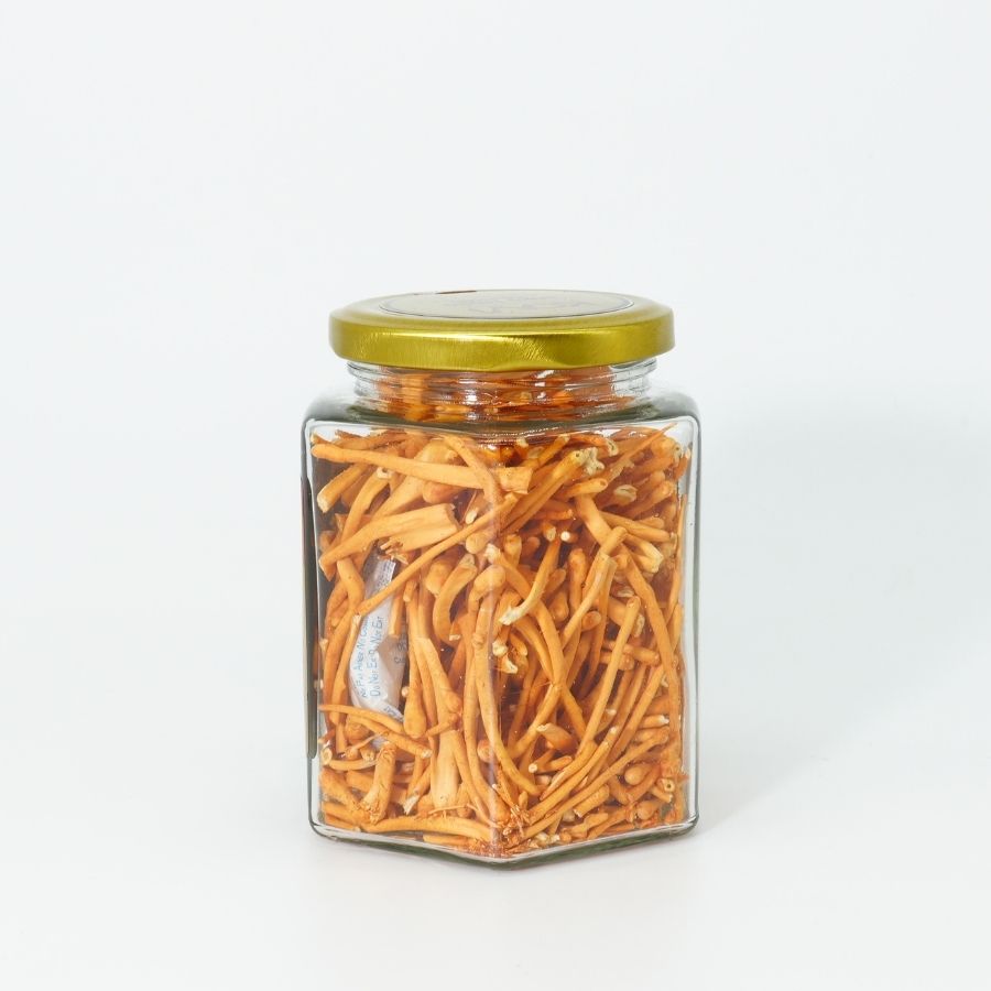 Đông Trùng Hạ Thảo khô KOVI 50g được đựng trong lọ thủy tinh cao cấp gồm thành phần 100% sợi đông trùng hạ thảo sấy thăng hoa.