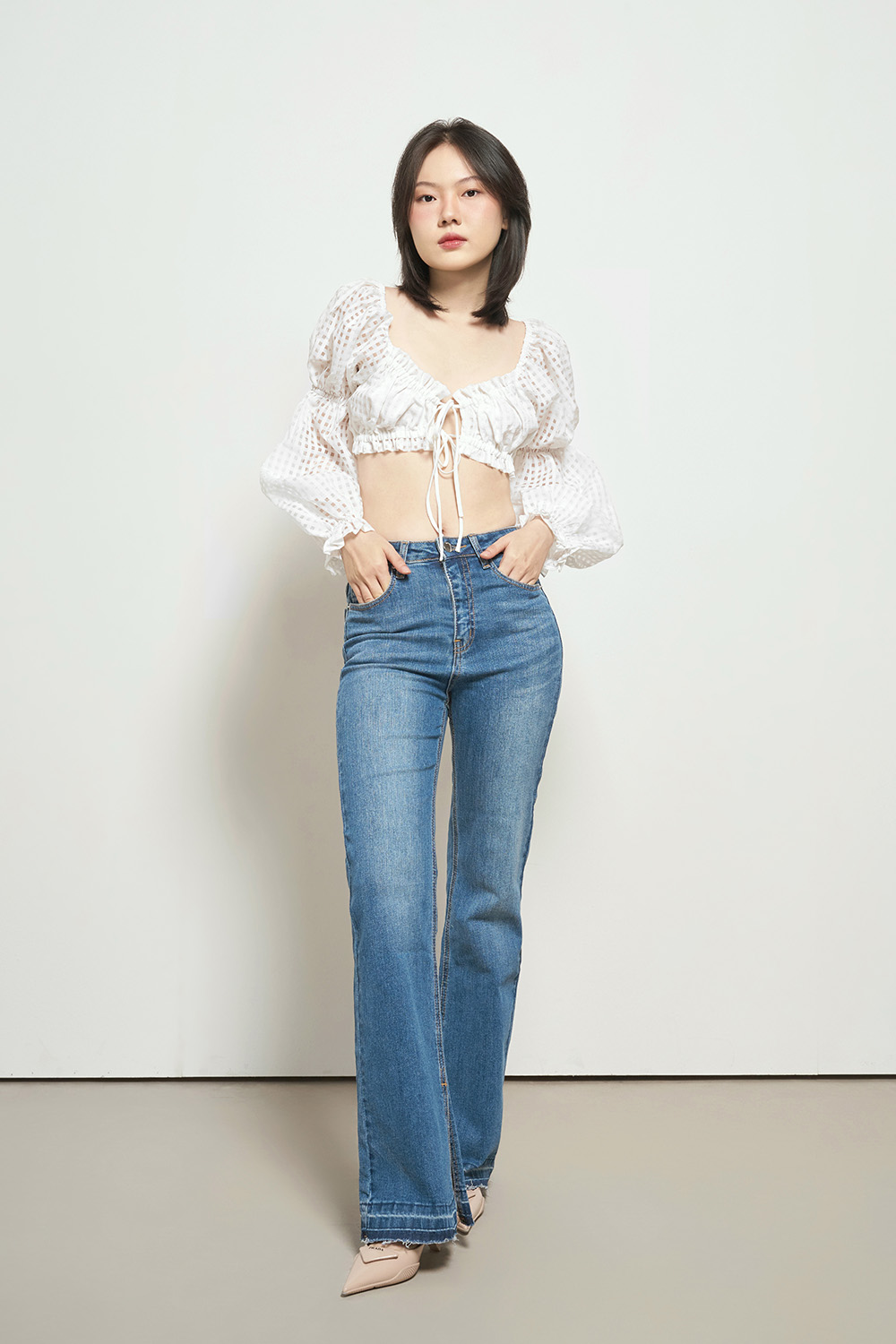 Áo croptop voan hoa với phần tay chuông trẻ trung, nữ tính. Áo có thể phối với nhiều loại trang phục theo nhiều phong cách từ quần, chân váy công sở đến quần sóc, chân