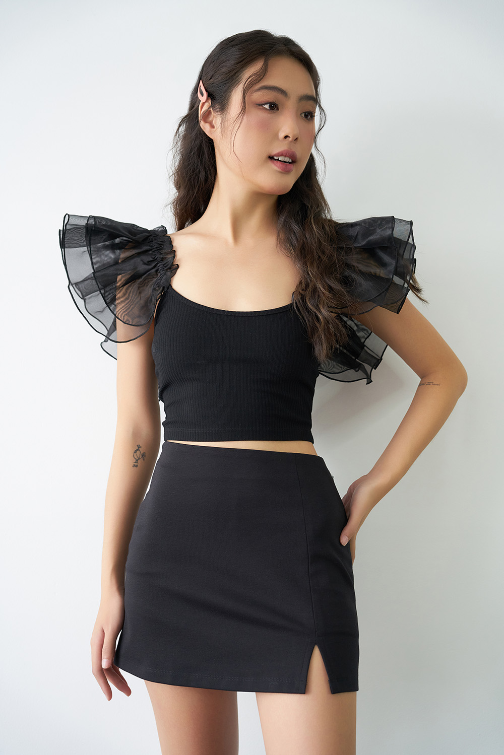 ✨DOTTIE - Áo phối vải tay cánh tiên - Đen - T0707