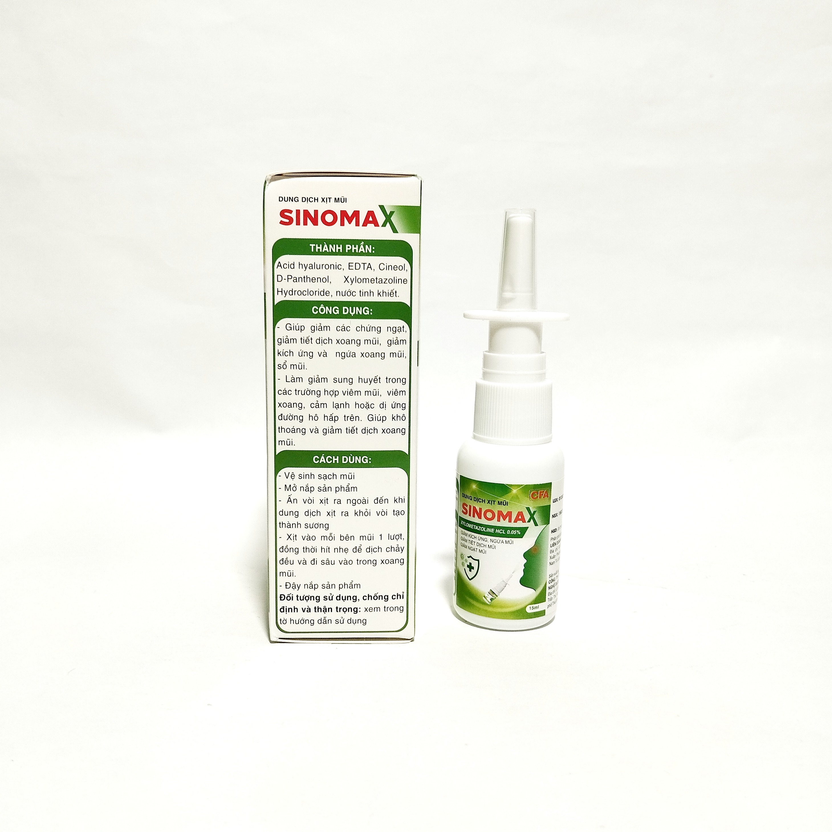 - Xịt xong đậy nắp sản phẩm THÀNH PHẦN Acid hyaluronic, EDTA, Cineol, D-panthenol, Xylometazoline Hydrocloride, nước tinh khiết QUY CÁCH ĐÓNG GÓI: Hộp 1 lọ xịt 15ml BẢO QUẢN: Để xa tầm tay của trẻ em. Nơi khô ráo, thoáng mát, tránh ánh nắng trực tiếp HẠN SỬ DỤNG: 3 năm kể từ ngày sản xuất, ngày sản xuất in trên bao bì sản phẩm