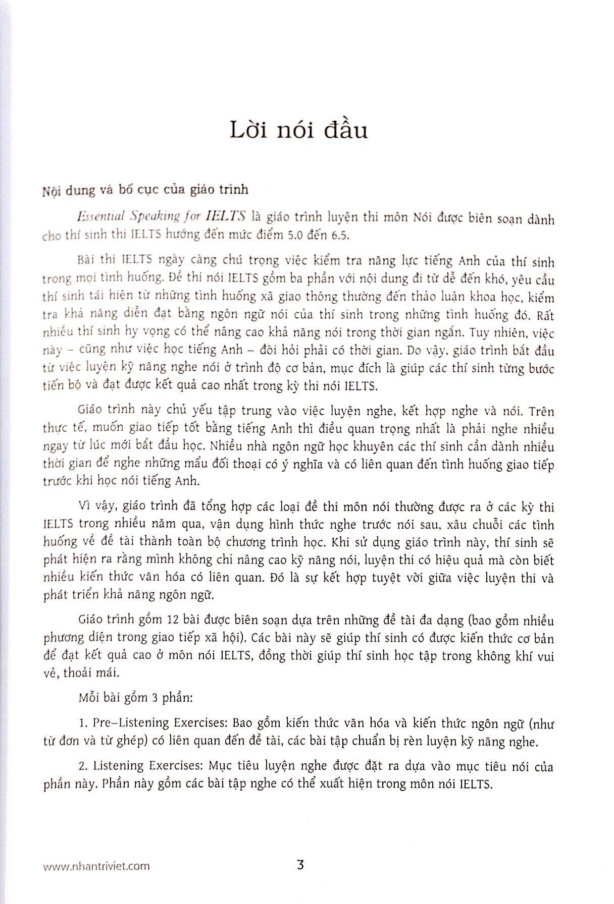 Essential Speaking for IELTS là giáo trình luyện thi môn Nói được biên soạn dành cho thí sinh thi IELTS hướng đến mức điểm 5.0 đến 6.5.