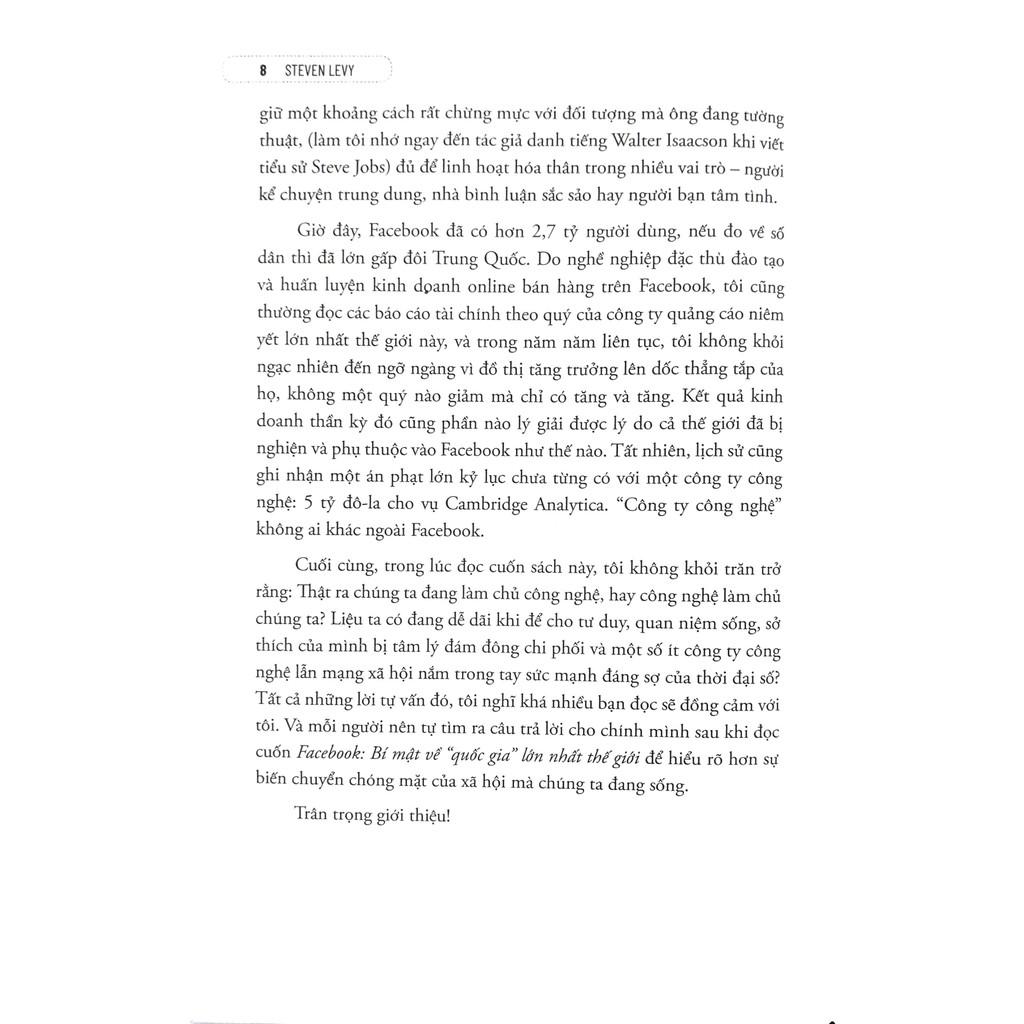 Mua tại TiktokCuốn sách nói về sự hình thành và phát triển của Facebook cùng những khó khăn, thách thức mà công ty này từng phải trải qua. Trong năm thứ hai đại học, Mark Zuckerberg đã tạo ra một trang web đơn giản hoạt động như một mạng xã hội trong khuôn viên trường. Trang này được đón nhận vô cùng mạnh mẽ và rất nhanh sau đó sinh viên trên toàn quốc đã đăng ký sử dụng Facebook. Từ một trang web đơn giản ban đầu, Mark Zuckerberg cùng đội ngũ đã nghiên cứu và phát triển thêm nhiều tính năng và ứng dụng cho Facebook, có những tính năng được đón nhận nhưng cũng có những tính năng thất bại và nhanh chóng biến mất sau đó. Và khi Facebook phát triển cũng là lúc các đối thủ cạnh tranh bắt đầu xuất hiện như Instagram, Snapchat… Cuốn sách cũng đưa ra thông tin về những cuộc đàm phán mua lại các công ty này của Zuckerberg. Càng phát triển mạnh mẽ, Facebook càng phải đối mặt với nhiều thách thức, khó khăn khi gặp phải những cáo buộc liên quan đến việc Facebook là nhân tố góp phần tác động vào kết quả của cuộc tranh cử tổng thống Mỹ năm 2016 giữa Donald Trump và Hillary Clinton khi công ty này không xử lý được việc những tin giả lan truyền trên Facebook và những hacker sử dụng nó để đánh cắp thông tin, cùng vụ bê bối dữ liệu Cambridge Analytica. Tác giả cũng đưa ra những thông tin về cách xử lý của Facebook cũng như Mark Zuckerberg đối với tin giả mạo, việc xử lý dữ liệu thông tin của người dùng cũng như kiểm duyệt nội dung. Đánh giá của chuyên gia, tổ chức uy tín về cuốn sách cùng các giải thưởng Một trong những cuốn sách về công nghệ hay nhất năm 2020 – Financial Times “Câu chuyện lịch sử toàn diện và hấp dẫn.” – The Wall Street Journal “Một câu chuyện mới mẻ, đầy tính cập nhật và nội bộ.” – The Economist Levy miêu tả một công ty công nghệ nơi không có ai chịu trách nhiệm về những gì nó đã phát hành… Cuốn sách khép lại với sự công nhận rằng Facebook đang đi trước với những sáng tạo mới – từ việc Facebook kết hợp với dự án tiền tệ kỹ thuật số Libra – trong khi Zuckerberg tiếp tục bác bỏ bất kỳ câu hỏi đạo đức nào về hành vi trong quá khứ của mình. ” – Financial Times Giá trị của cuốn sách này nằm ở chỗ nó tập hợp tất cả các vấn đề về quyền riêng tư, thuật toán của Facebook và vụ Cambridge Analytica. ” – Library Journal