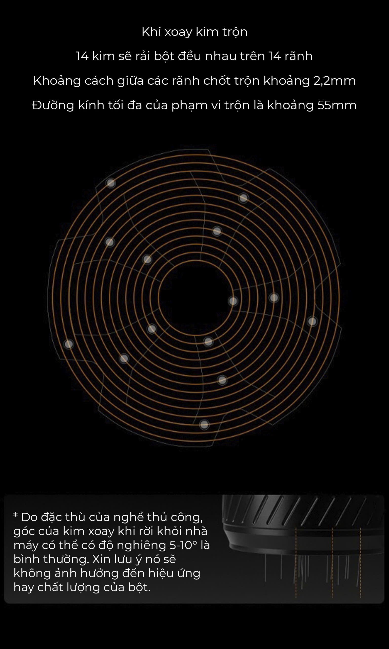 ️ Hệ thống 14 kim inox 304 siêu mảnh, dày 0,25mm sắp xếp theo 14 vòng tròn đồng tâm, giúp phân bổ bột tối ưu, hạn chế kênh rãnh (channeling).